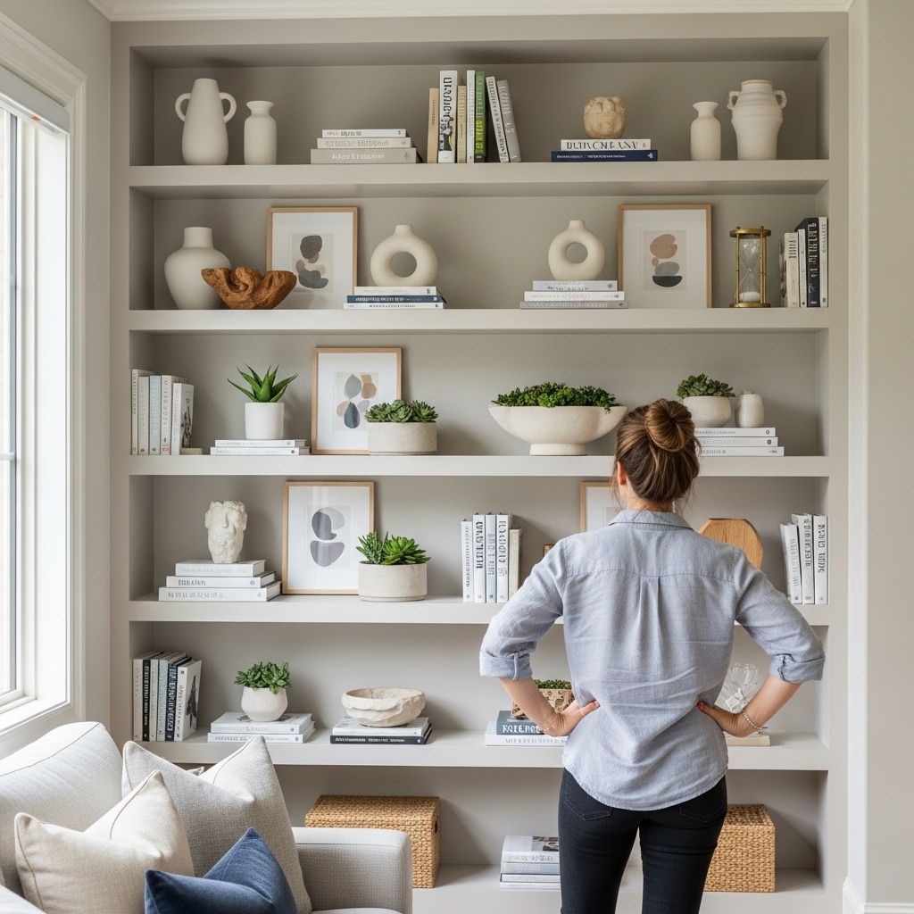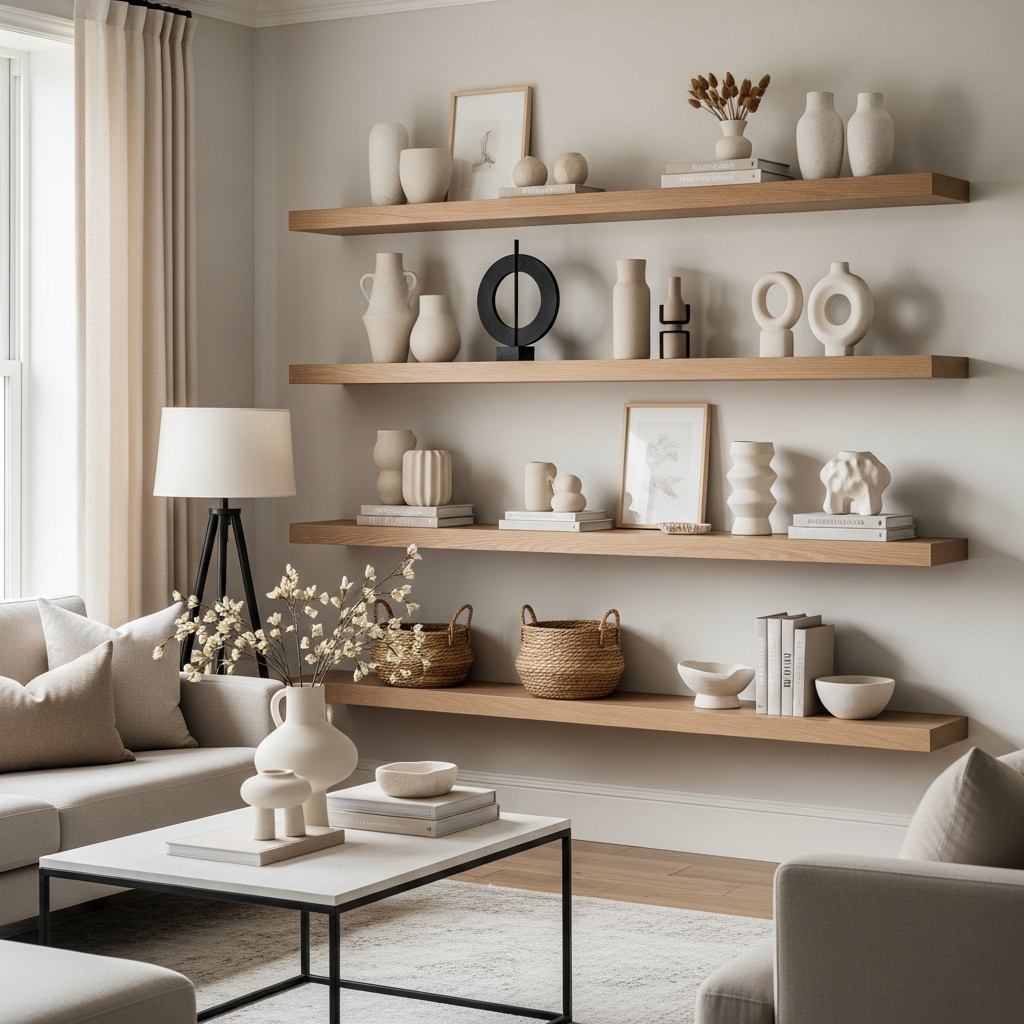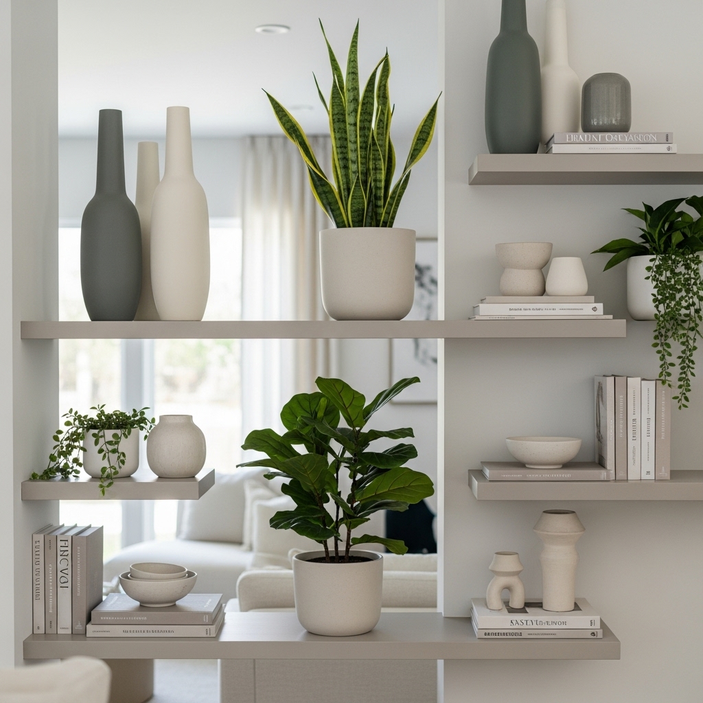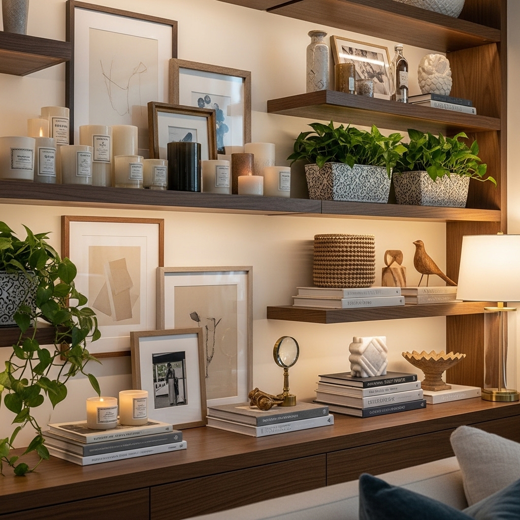 Styling living room shelves doesn’t require a professional interior designer—just the right approach. By mixing heights, balancing objects, adding greenery, sticking to a color palette, and editing thoughtfully, you can easily transform your shelves into a designer-level focal point.