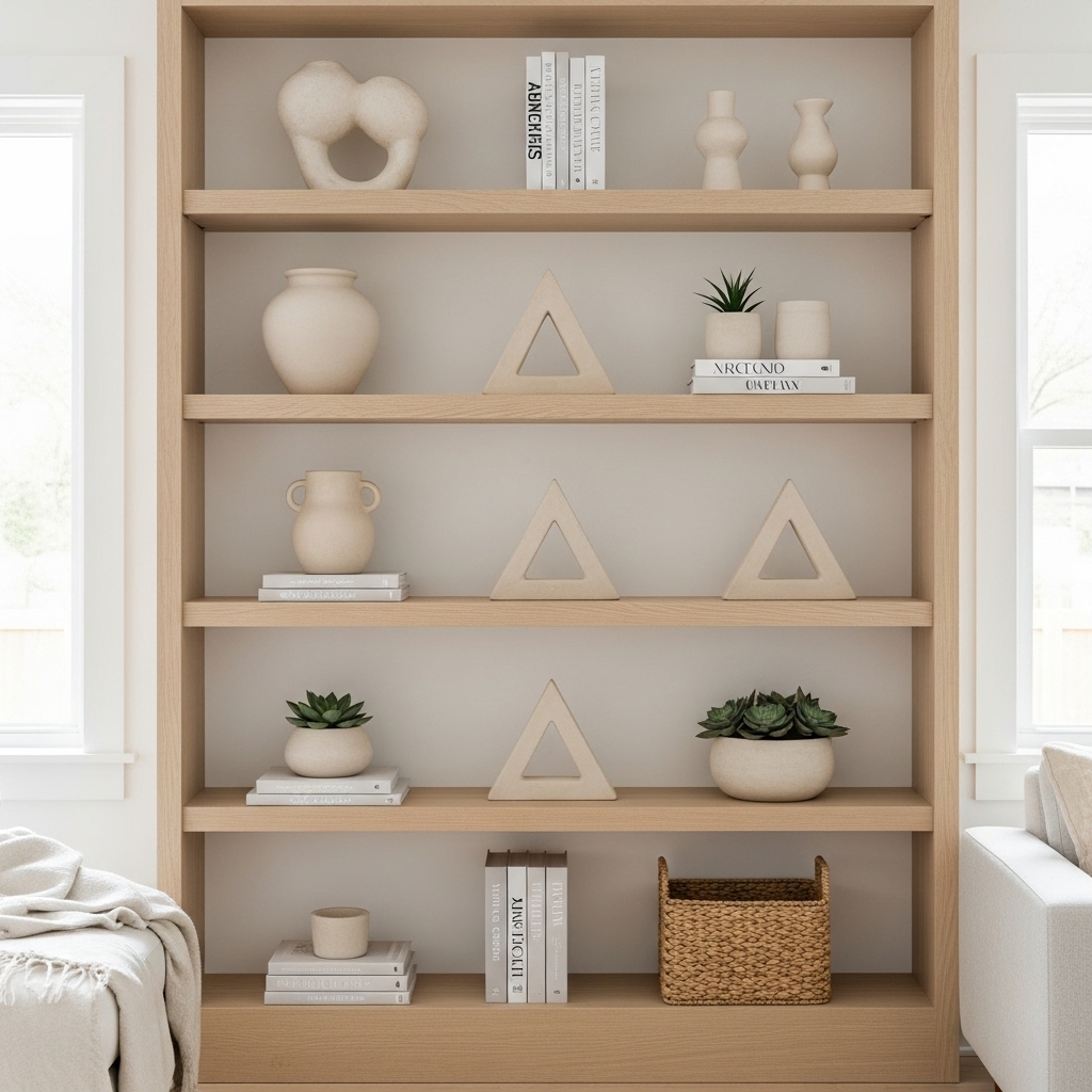 Designers often rely on visual triangles to create flow and balance. This means choosing three related items—whether by color, size, or style—and placing them in a triangular pattern across your shelves.