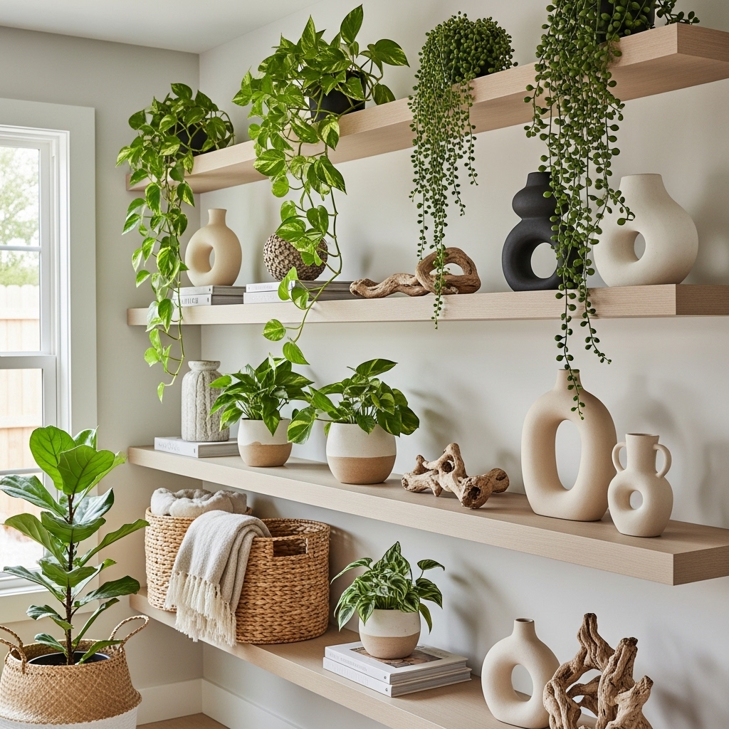 Plants are a non-negotiable for designer-level shelves. They soften the look, add color, and bring a refreshing natural touch to your living room.