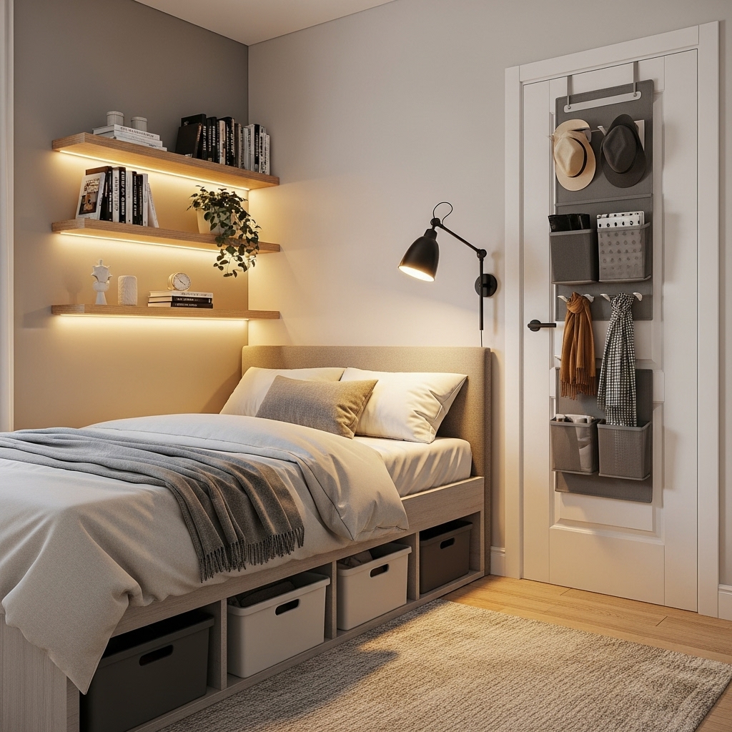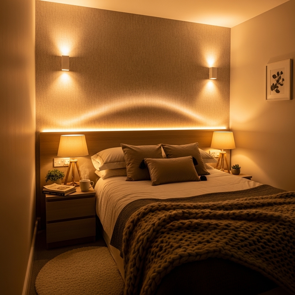 • LED strip lights under shelves or behind the headboard add soft ambient lighting.