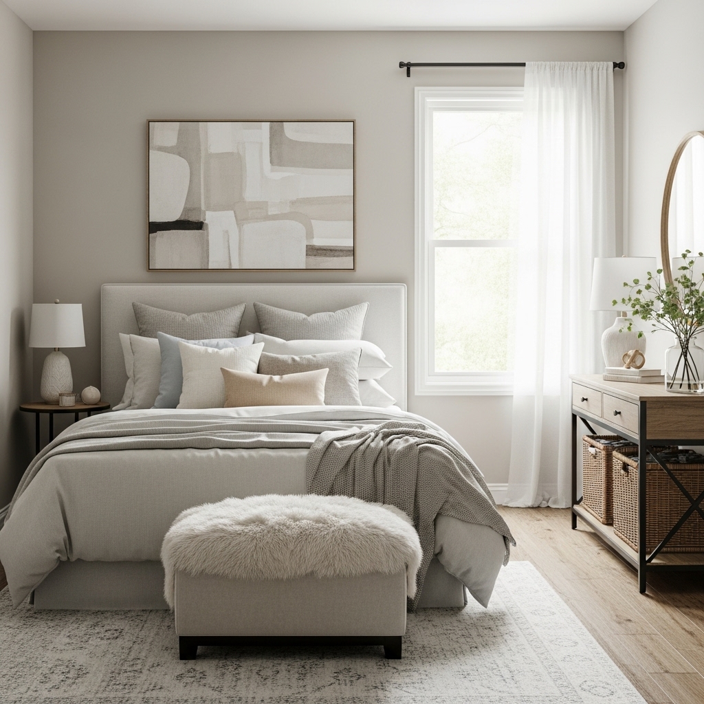 Stick with soft neutrals, such as white, beige, blush, or pale gray, to create a calming and visually expanded look. You can add texture and warmth through bedding, throw pillows, and accent rugs.