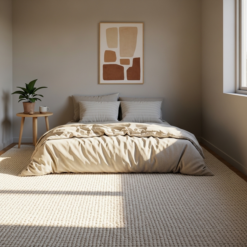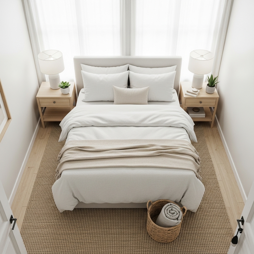 In small bedrooms, less is more. Keep your décor simple, cohesive, and clutter-free. Stick with a neutral palette and introduce texture through textiles — linen bedding, woven rugs, or a chunky knit throw.