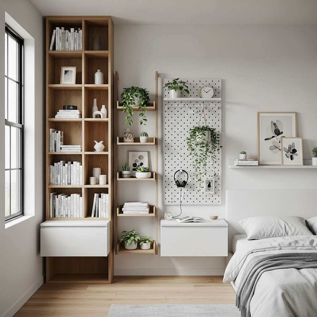 Install tall bookcases or ladder shelves to display décor, books, or baskets. You can even mount floating nightstands or peg rails for accessories.