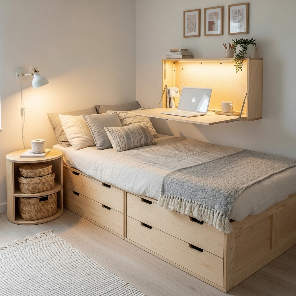 Another great option is a foldable wall-mounted desk, perfect for small bedrooms that double as home offices. When not in use, simply fold it down to free up valuable floor space.
