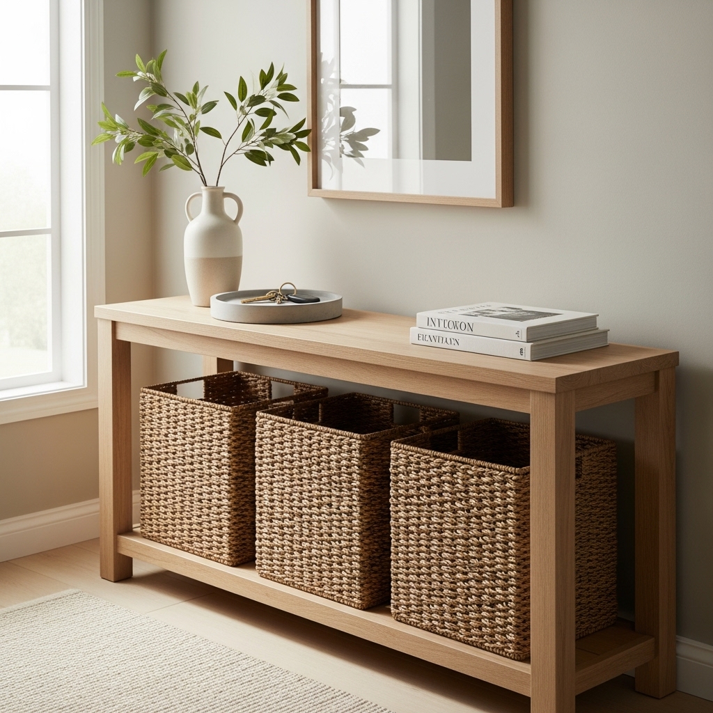 If your entryway table has open space underneath, add baskets for both style and practicality.