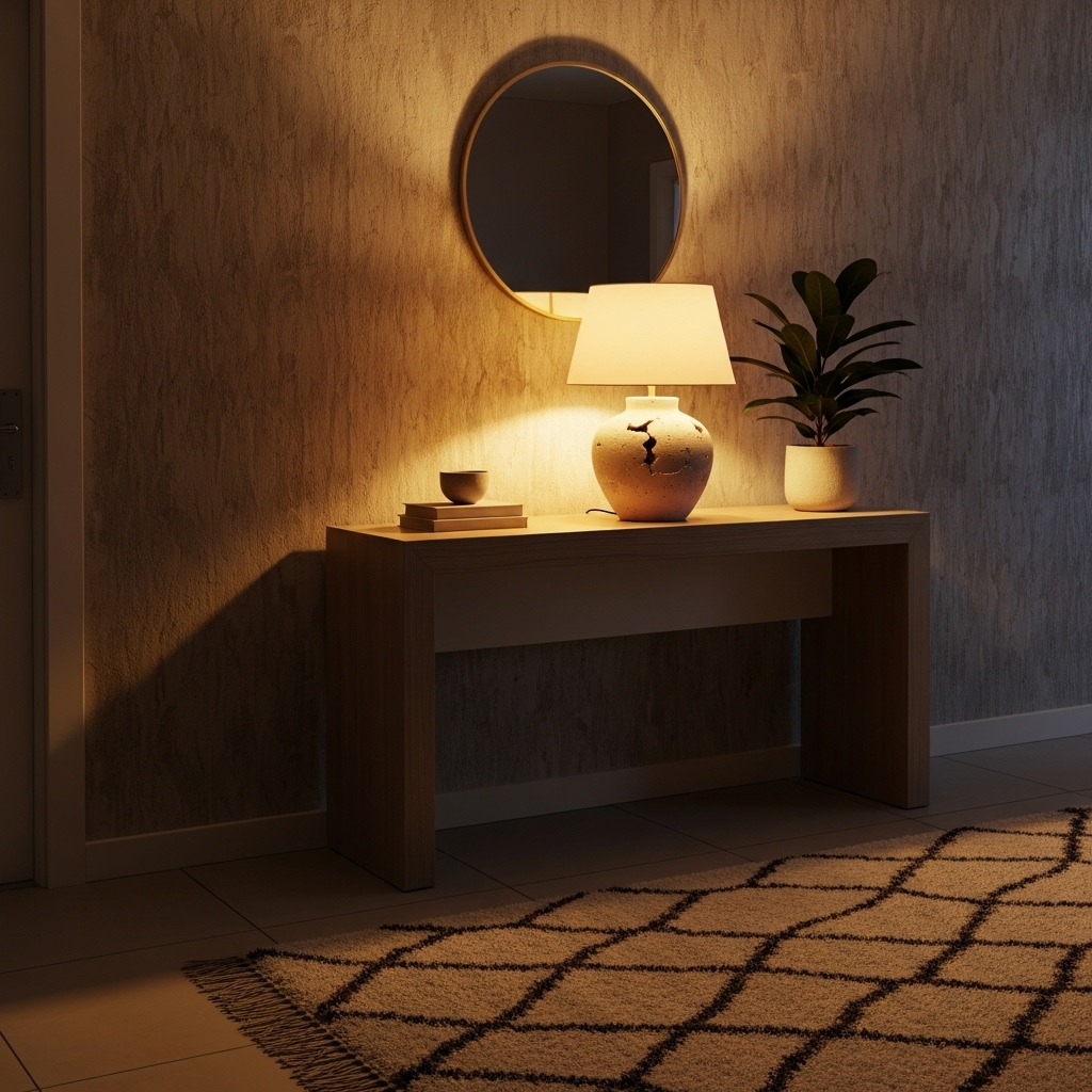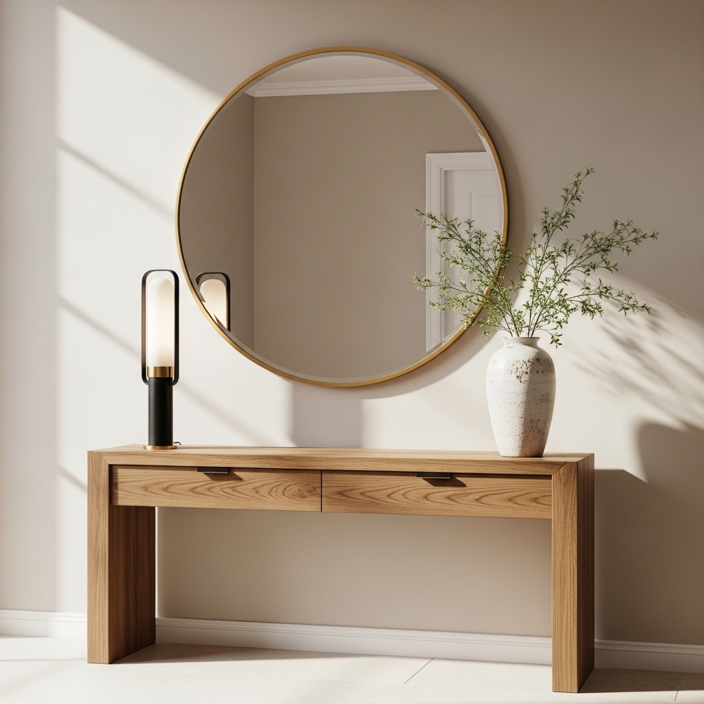Pro Tip: Hang the mirror or artwork around 6–8 inches above the table to create balance Entryway Table Decor Ideas.