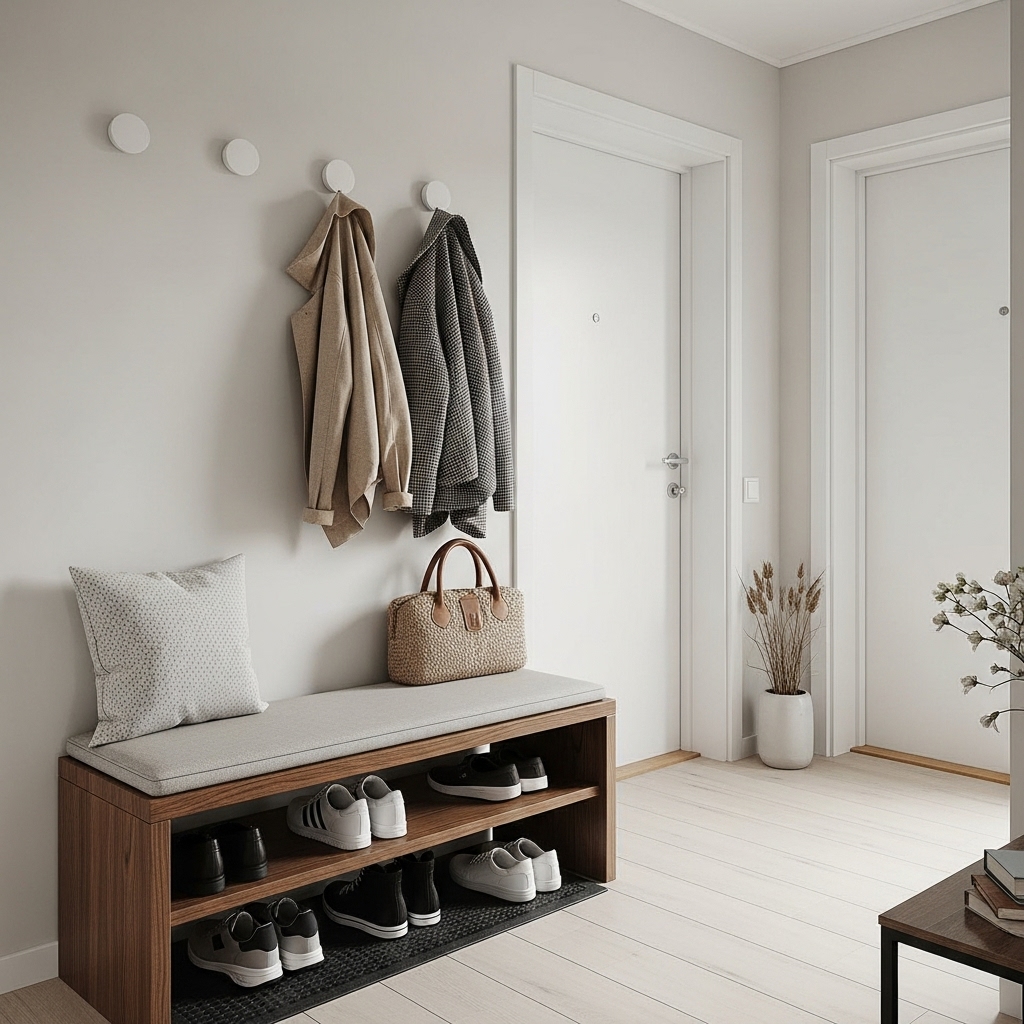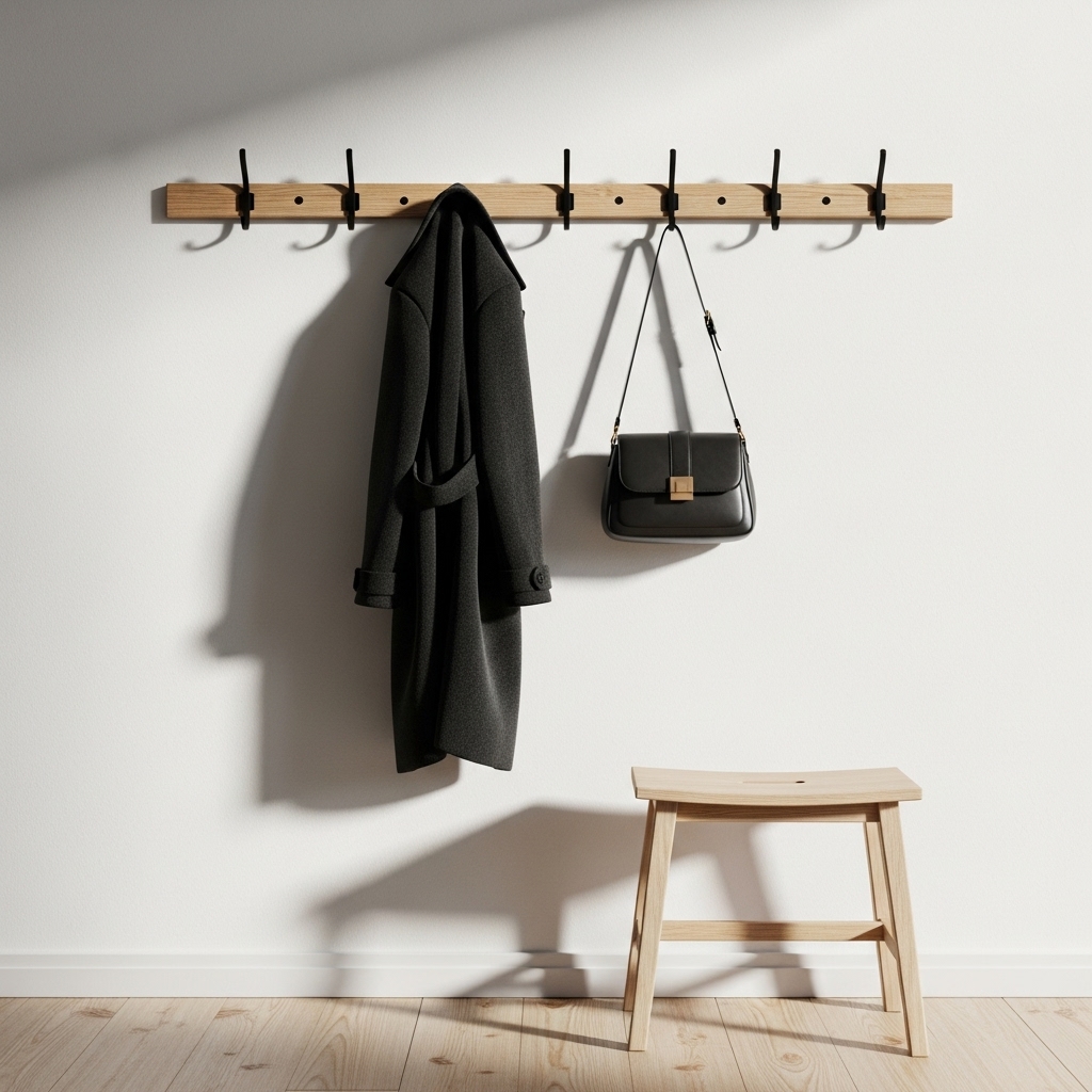 Instead of a bulky coat rack, opt for simple wall hooks or a sleek peg rail. These reduce floor clutter and add visual interest to the walls. Keep a tight limit on what hangs there—only daily essentials like bags and jackets Minimal Entryway Decor Ideas.