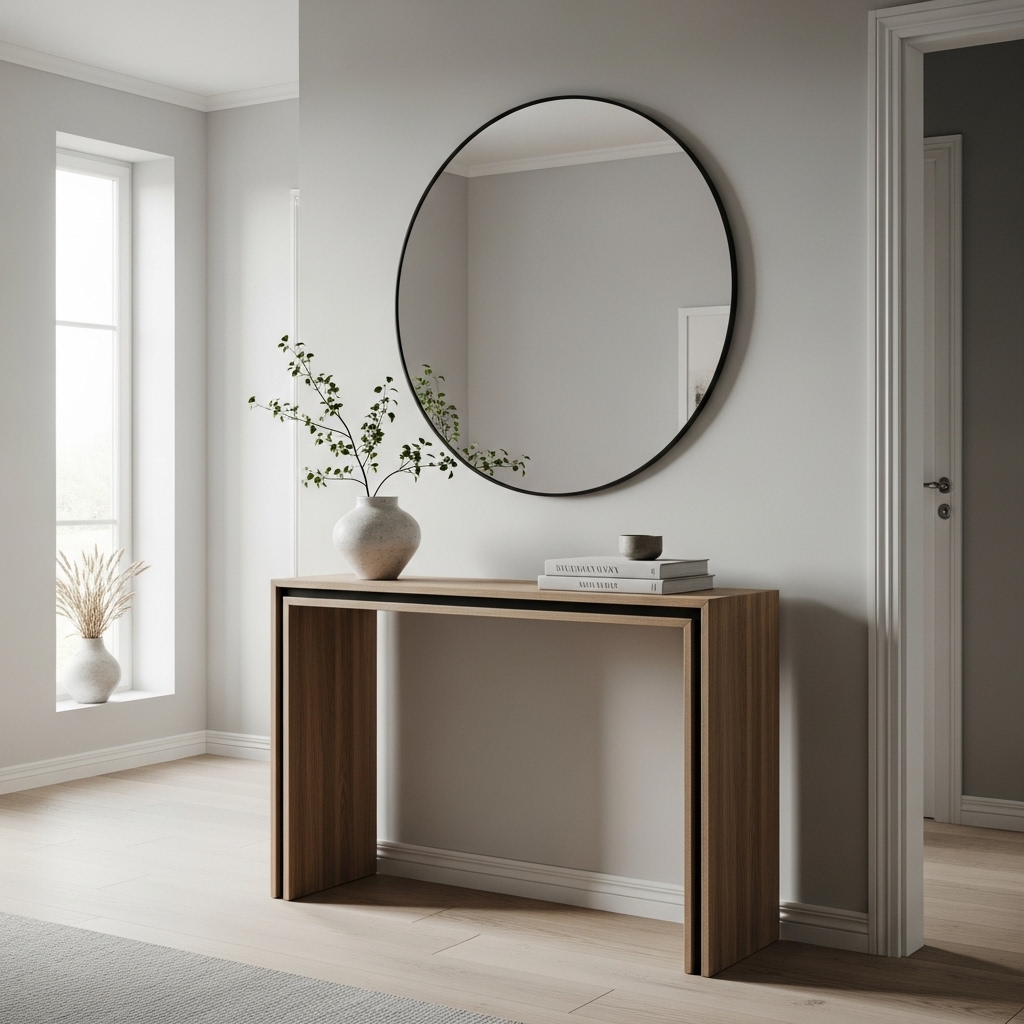 A large round or rectangular mirror instantly brightens and visually expands the entryway. Stick to simple frames—black metal, natural wood, or frameless designs work perfectly. A mirror also adds practicality and timeless style in one piece.