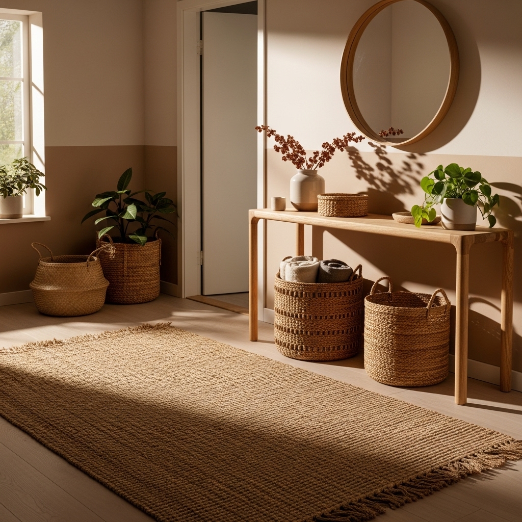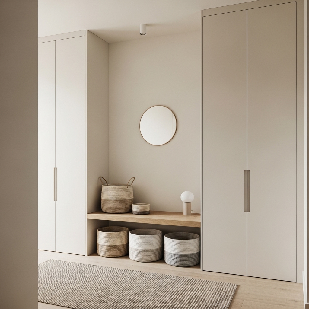 A minimalist entry still needs places to store essentials. Use closed cabinets or baskets to keep shoes, scarves, and mail out of sight. Stylish bins under a console table offer easy grab-and-go storage while preserving order. The key idea: everything must have a home.