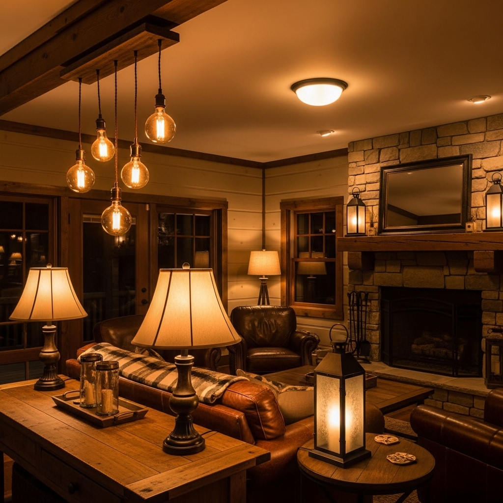 Harsh lighting ruins the cozy atmosphere of a cabin-inspired space. Instead, layer warm, soft lighting sources like: