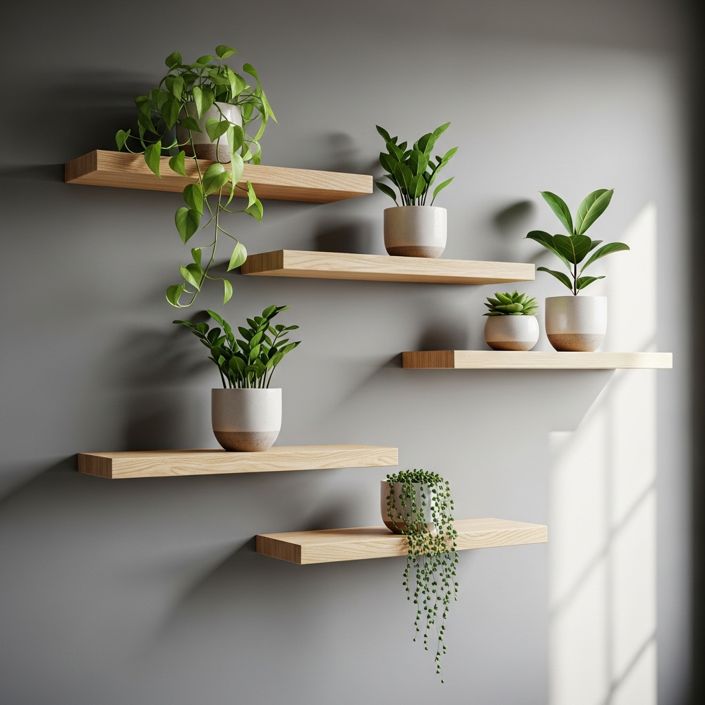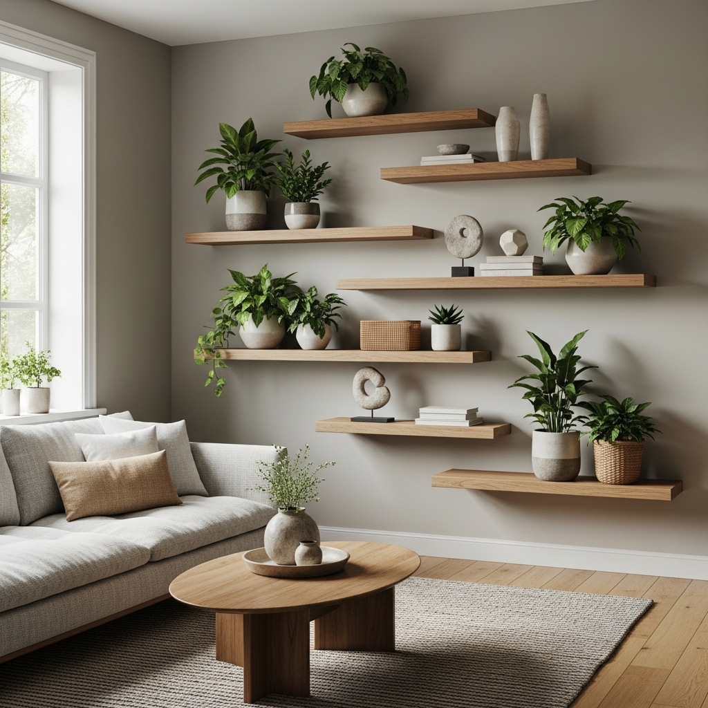 Install multiple floating shelves at varied heights and add small pots of greenery. This style is minimalist and flexible — ideal for small spaces or apartment walls.