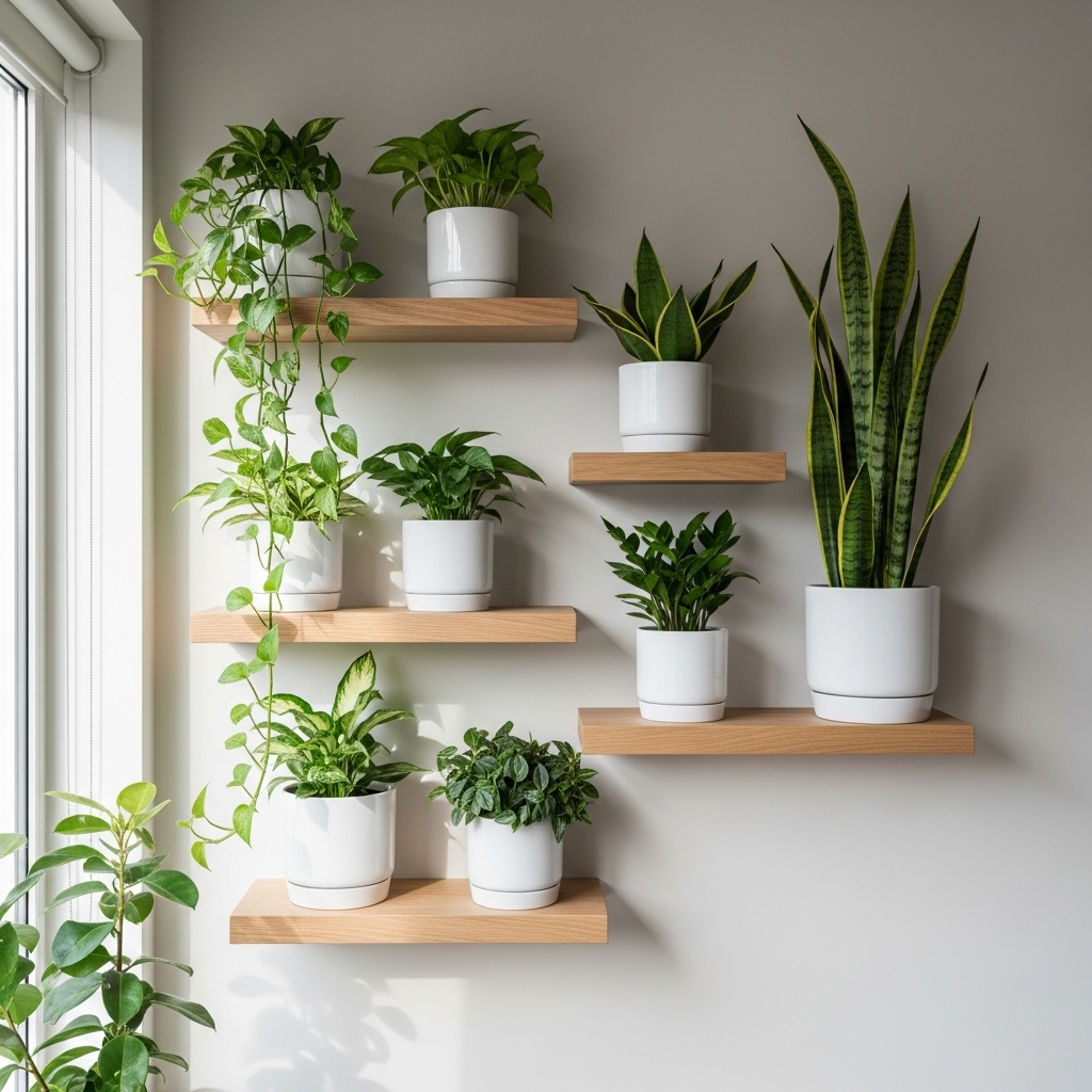 For a boho touch, pair handcrafted wooden shelves with white ceramic pots and trailing greenery. Keep the color palette neutral — whites, beiges, and soft greens — for a minimalist, cohesive look.