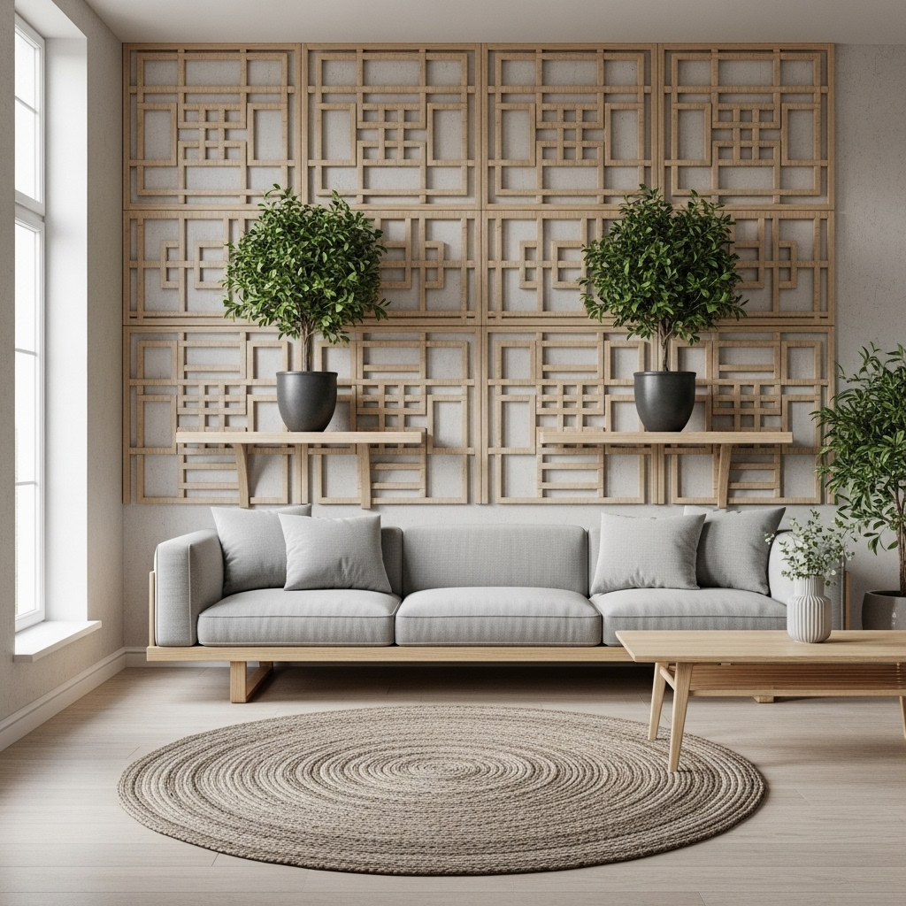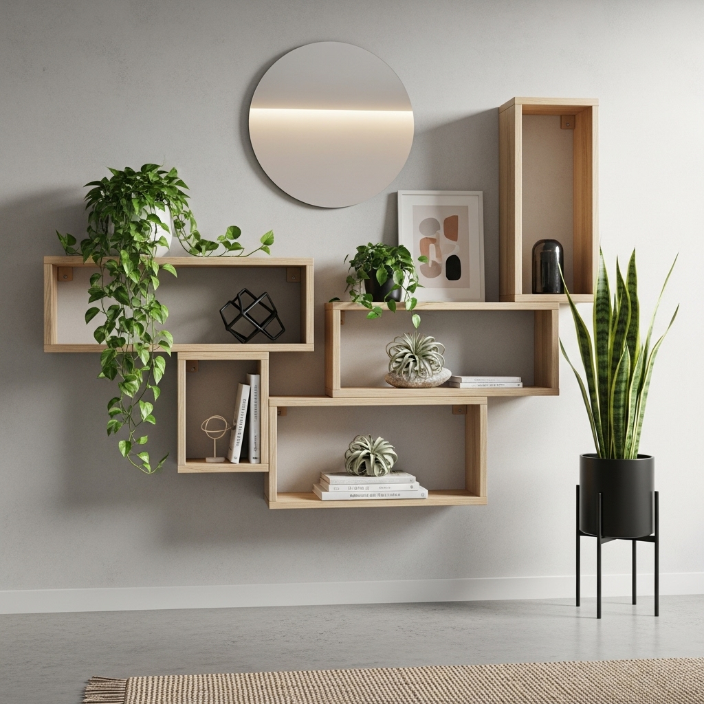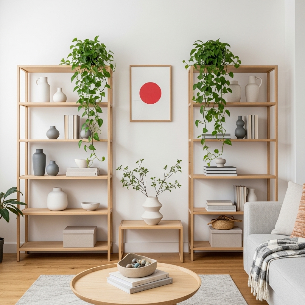 Embrace the calm of Japandi design, where Japanese minimalism meets Scandinavian warmth. Use geometric wooden shelves with potted greenery against a neutral grey wall. This setup brings harmony, balance, and serenity to your living room.