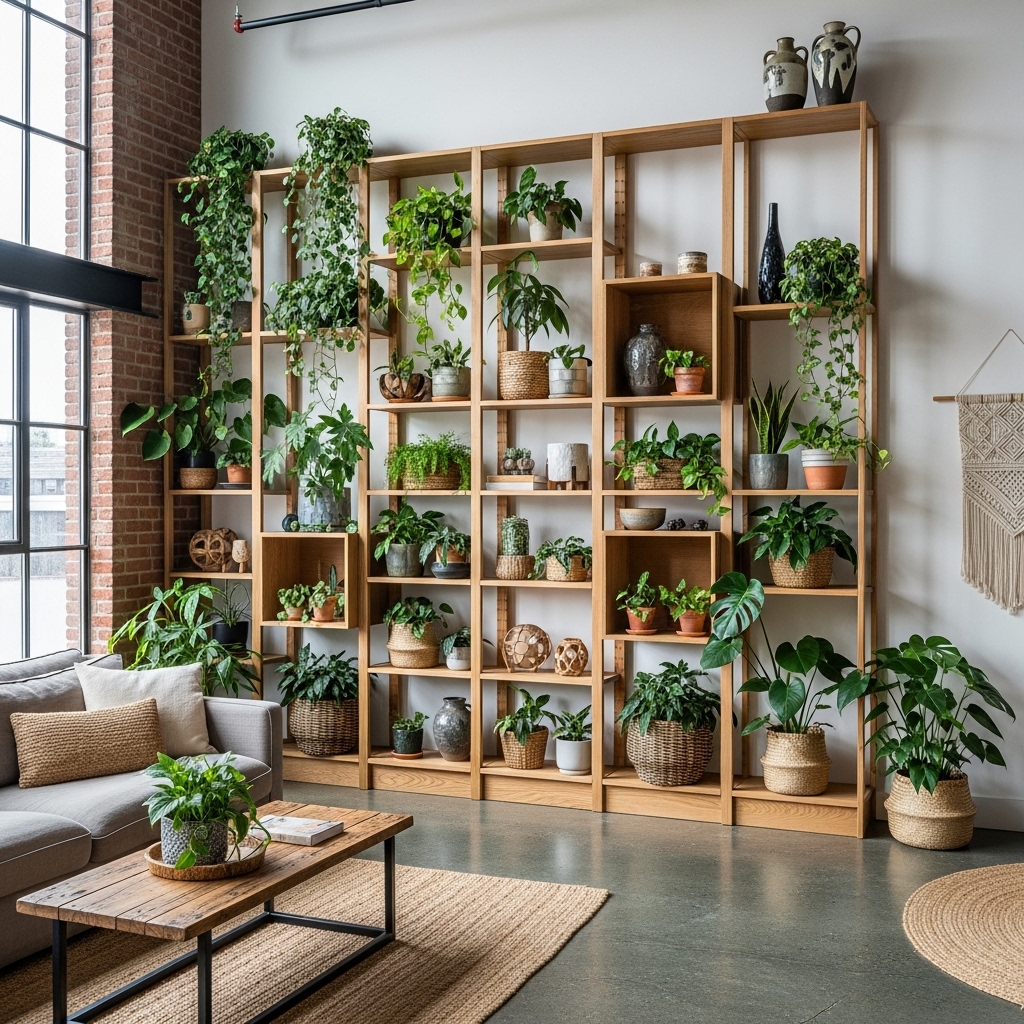 For modern lofts, a large-scale wooden plant installation creates a stunning contrast against industrial elements like brick or metal. It softens the space while keeping it chic.