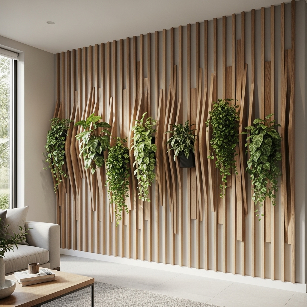 Install vertical wood slats with built-in ledges for small planters. This design offers structure and elegance while maintaining a minimalist aesthetic — a great idea for hallways or living areas.