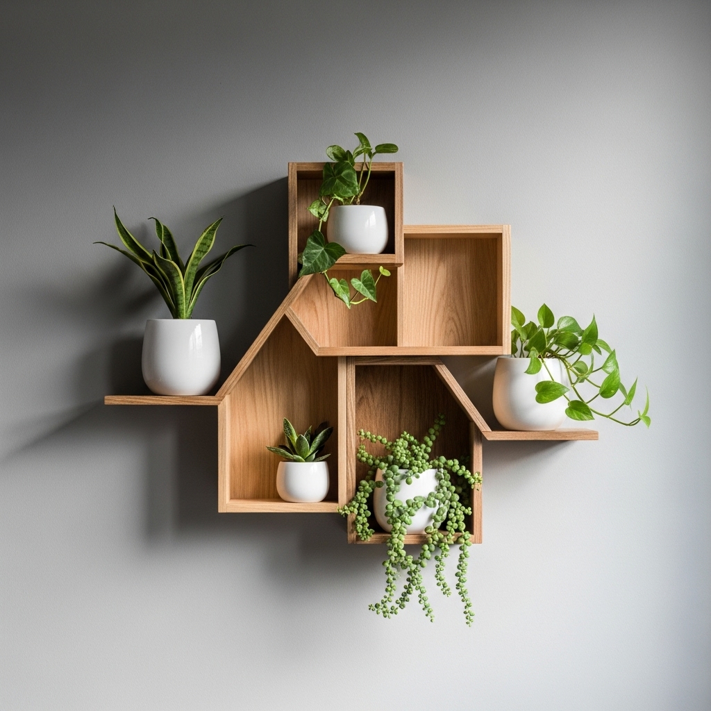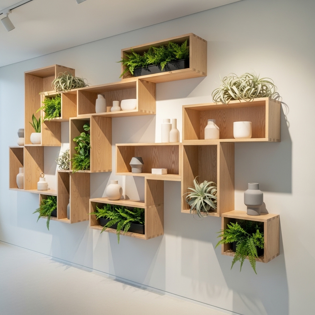 Perfect for apartment living, this idea uses floating wooden shelves and modern ceramic planters to create an urban oasis. Add LED lighting for a cozy nighttime effect.