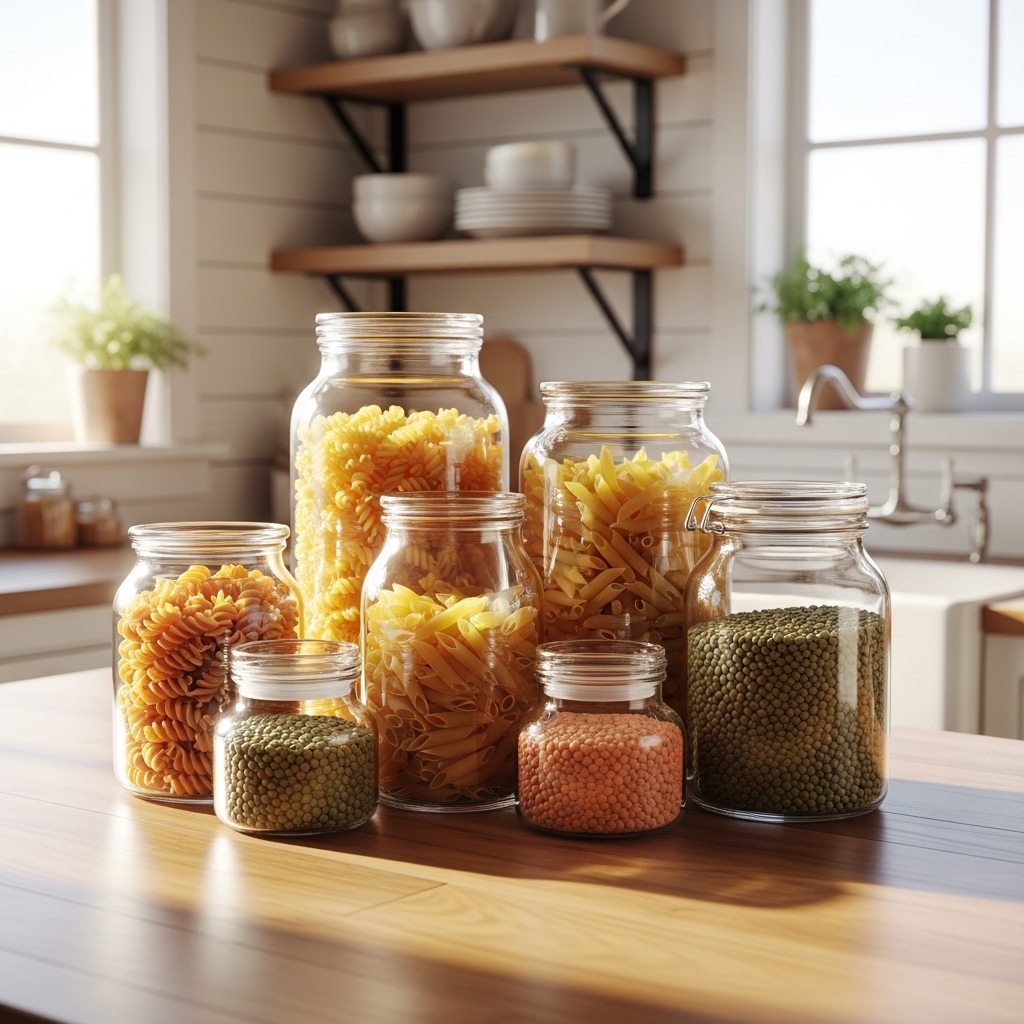 Glass jars filled with pasta, rice, or lentils aren’t just practical—they’re decorative too. Place a few on your counter for a rustic, homely vibe.