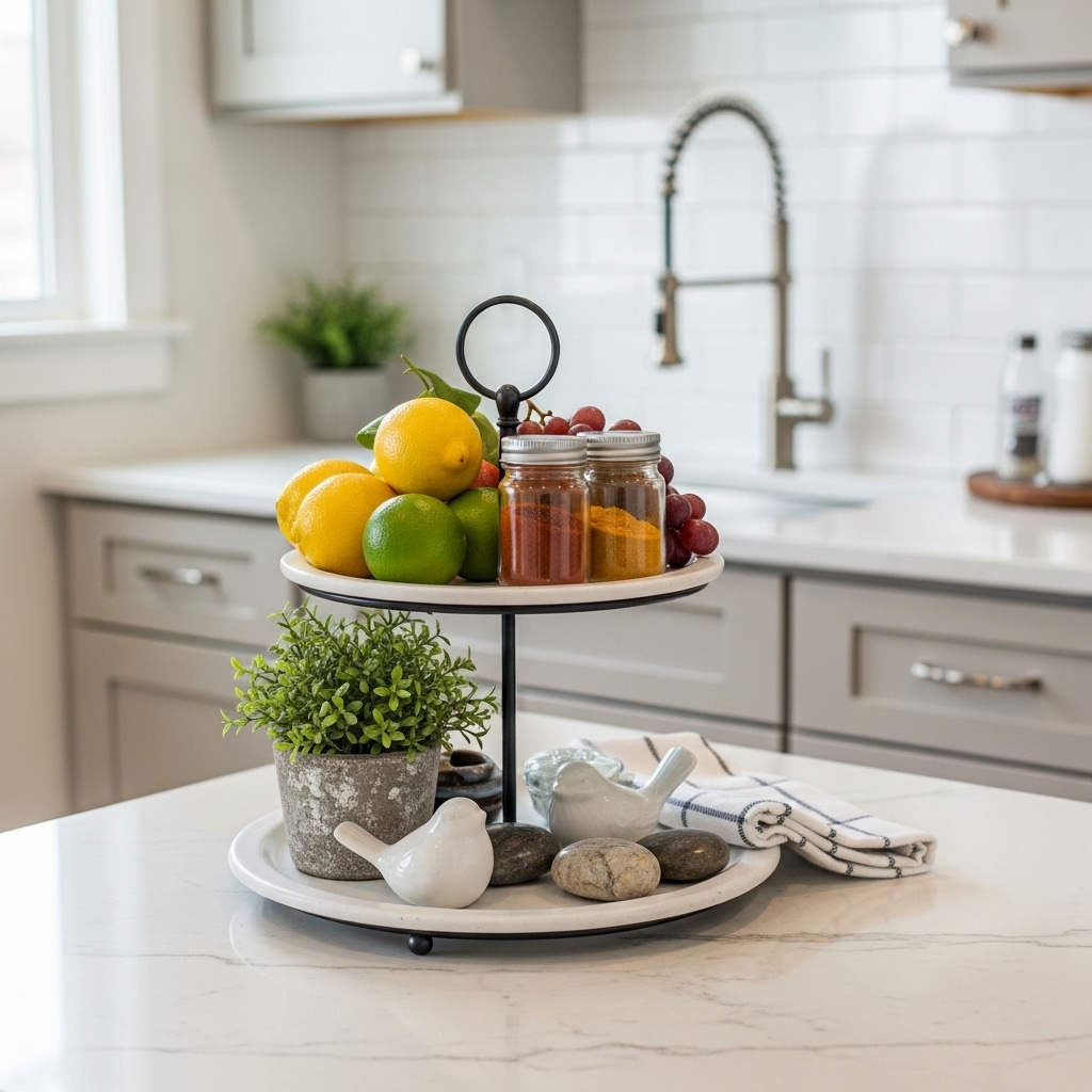 A tiered tray stand is perfect for small kitchens where counter space is limited. It allows you to store and display more while taking up less surface area.