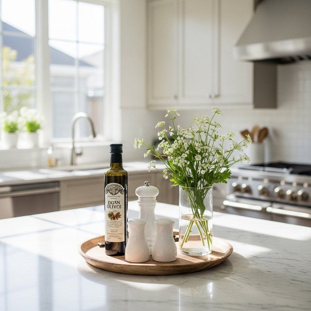 A decorative tray instantly makes your countertop look organized and elegant. Use it to corral everyday items like olive oil, salt, pepper, and a small vase of flowers. Not only does it keep things neat, but it also makes cleaning your countertop easier.