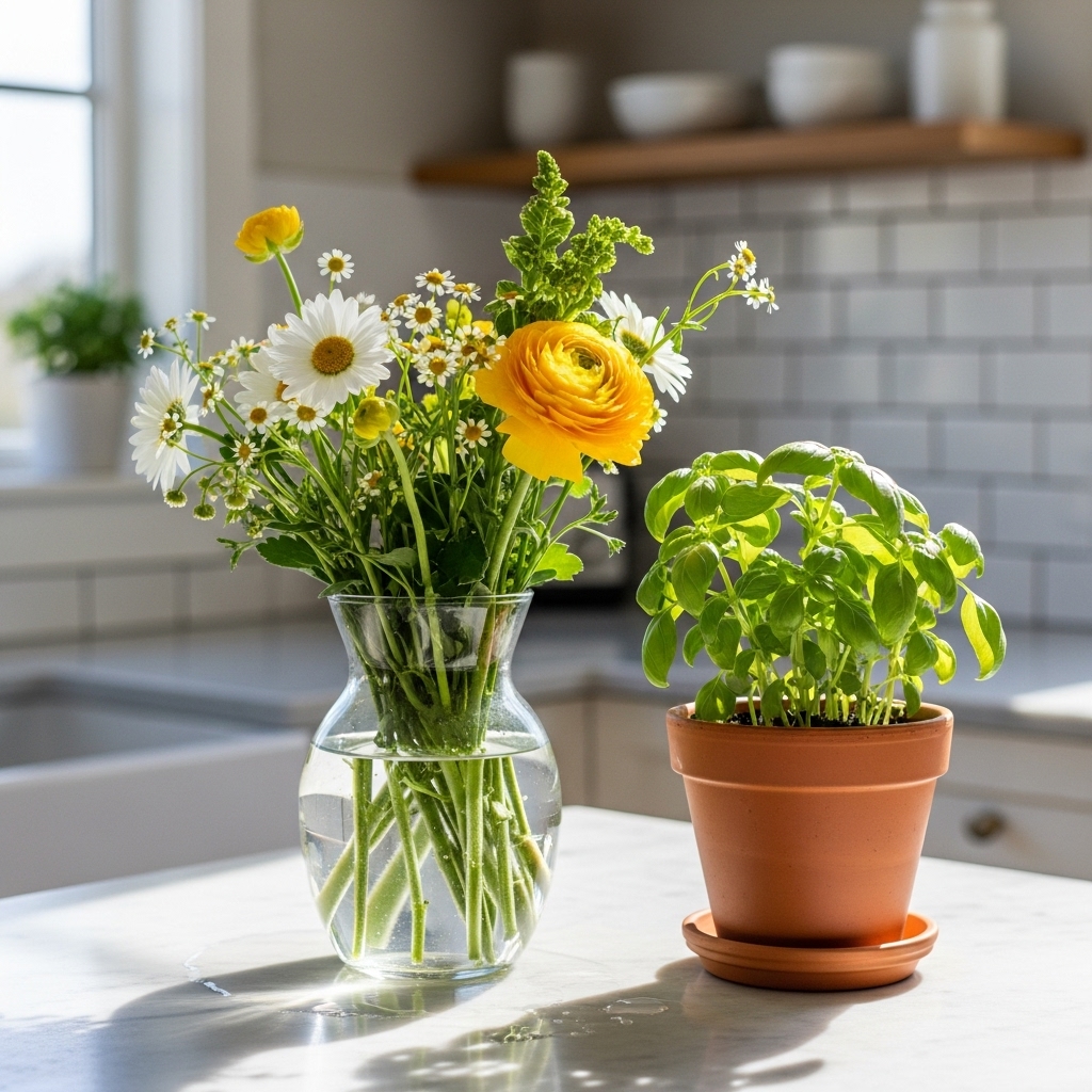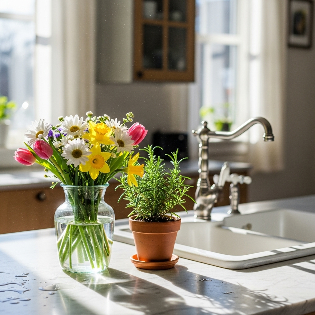 Nothing livens up a kitchen like a vase of fresh flowers or a small pot of greenery. This simple touch brings life, freshness, and a pop of color to your countertop. Consider eucalyptus, rosemary, or even a mini herb garden for a practical twist.