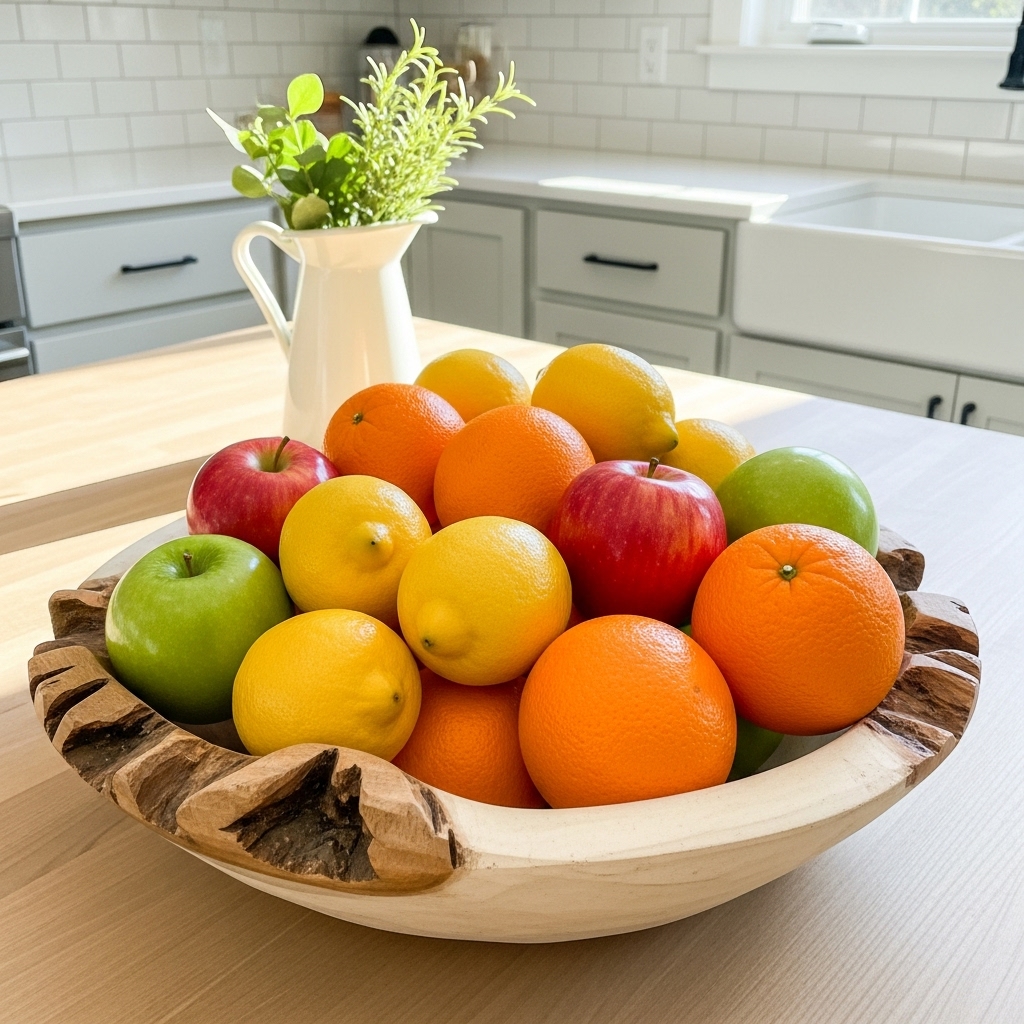 A classic fruit bowl adds instant color and warmth. Go with a ceramic or wooden bowl for a timeless look. Fresh lemons, apples, or oranges add vibrancy while remaining functional.