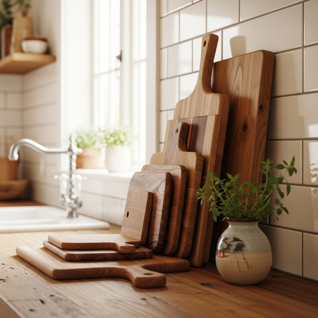 Oversized cutting boards double as decor and function. Prop a few against your backsplash for a layered look. They bring warmth and texture to otherwise sleek countertops, especially in kitchens with neutral color palettes.