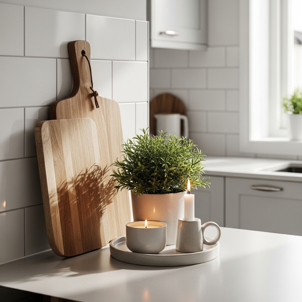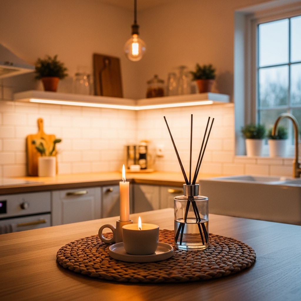Fragrance is just as important as visuals. A chic candle, reed diffuser, or essential oil diffuser can make your kitchen smell as inviting as it looks.