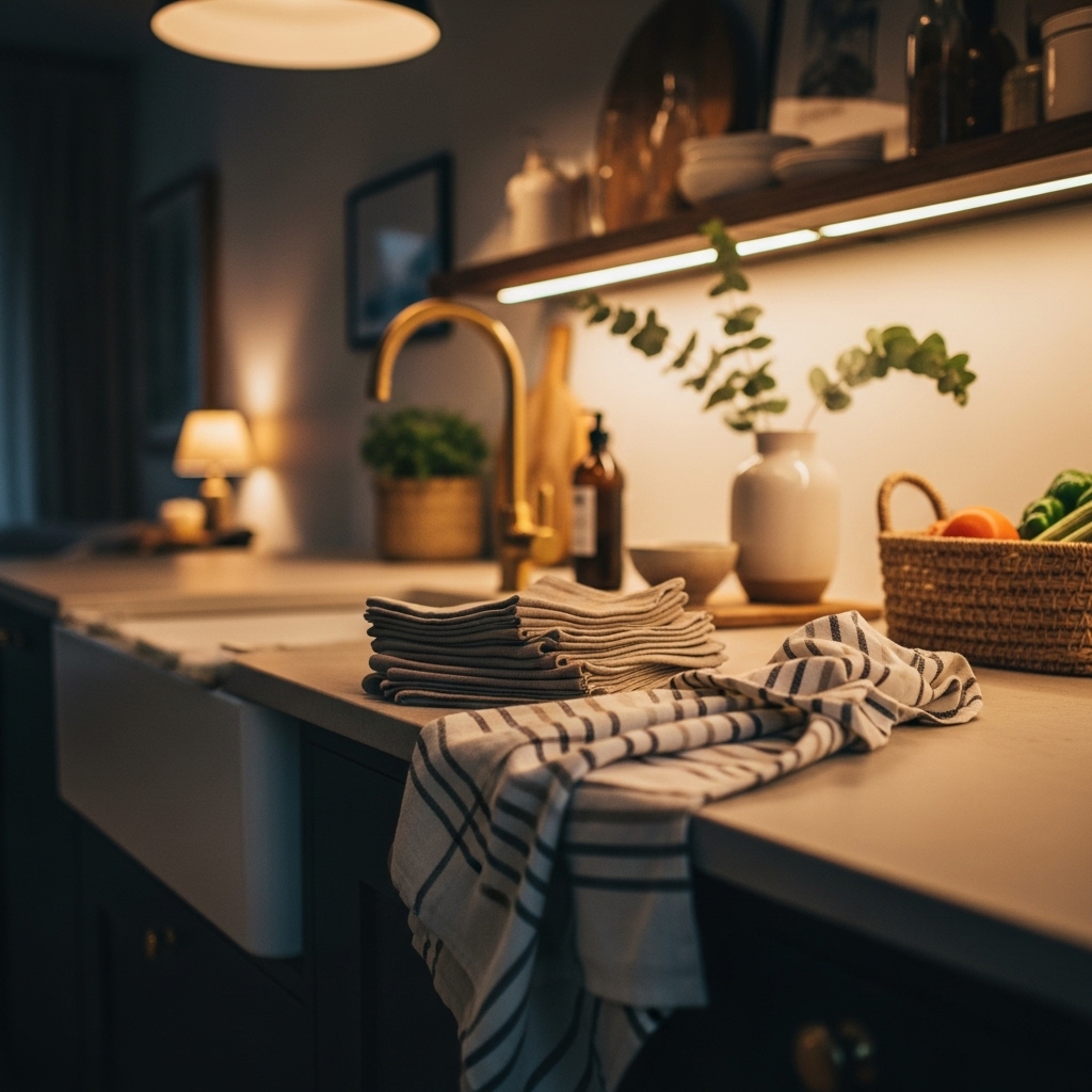 Folded linen napkins, a striped dish towel draped casually, or even a small runner across the counter can soften the space and add texture.