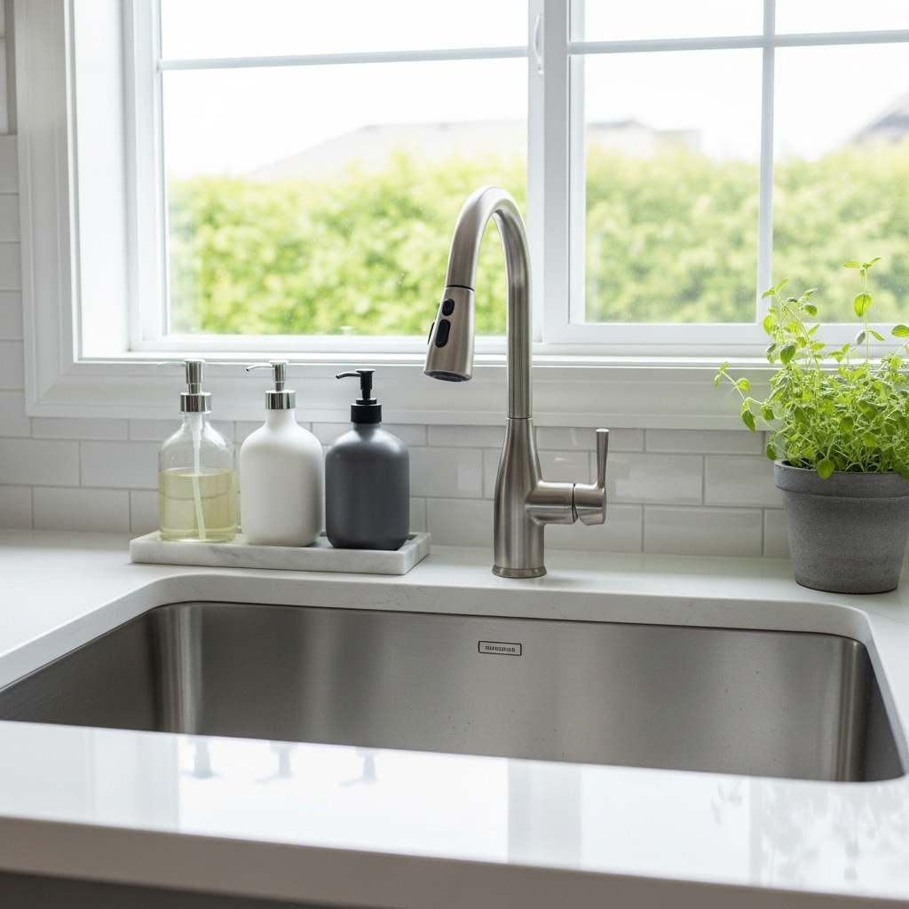 Replace branded dish soap bottles with sleek refillable dispensers. Opt for glass, amber, or ceramic pumps to elevate even the most mundane kitchen essentials.