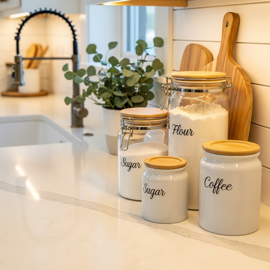 Swap out store-bought packaging for decorative canisters. Glass, ceramic, or matte black containers can hold flour, sugar, coffee, or pasta while adding visual interest. This idea works particularly well in both modern and farmhouse kitchens.