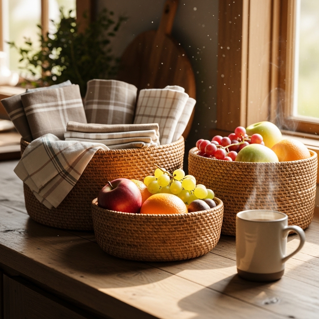 Woven baskets are a great way to contain produce, linens, or utensils while doubling as decor. Choose baskets with natural tones for a rustic feel or black wire for a modern touch.