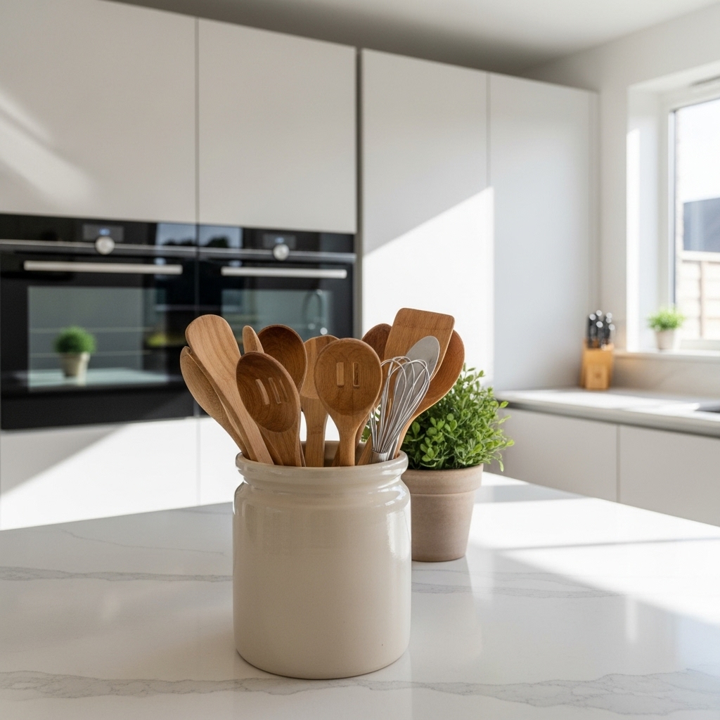 Instead of tossing utensils into a drawer, use a stylish ceramic crock or metal container to hold your wooden spoons, spatulas, and whisks. It keeps them handy while adding charm.