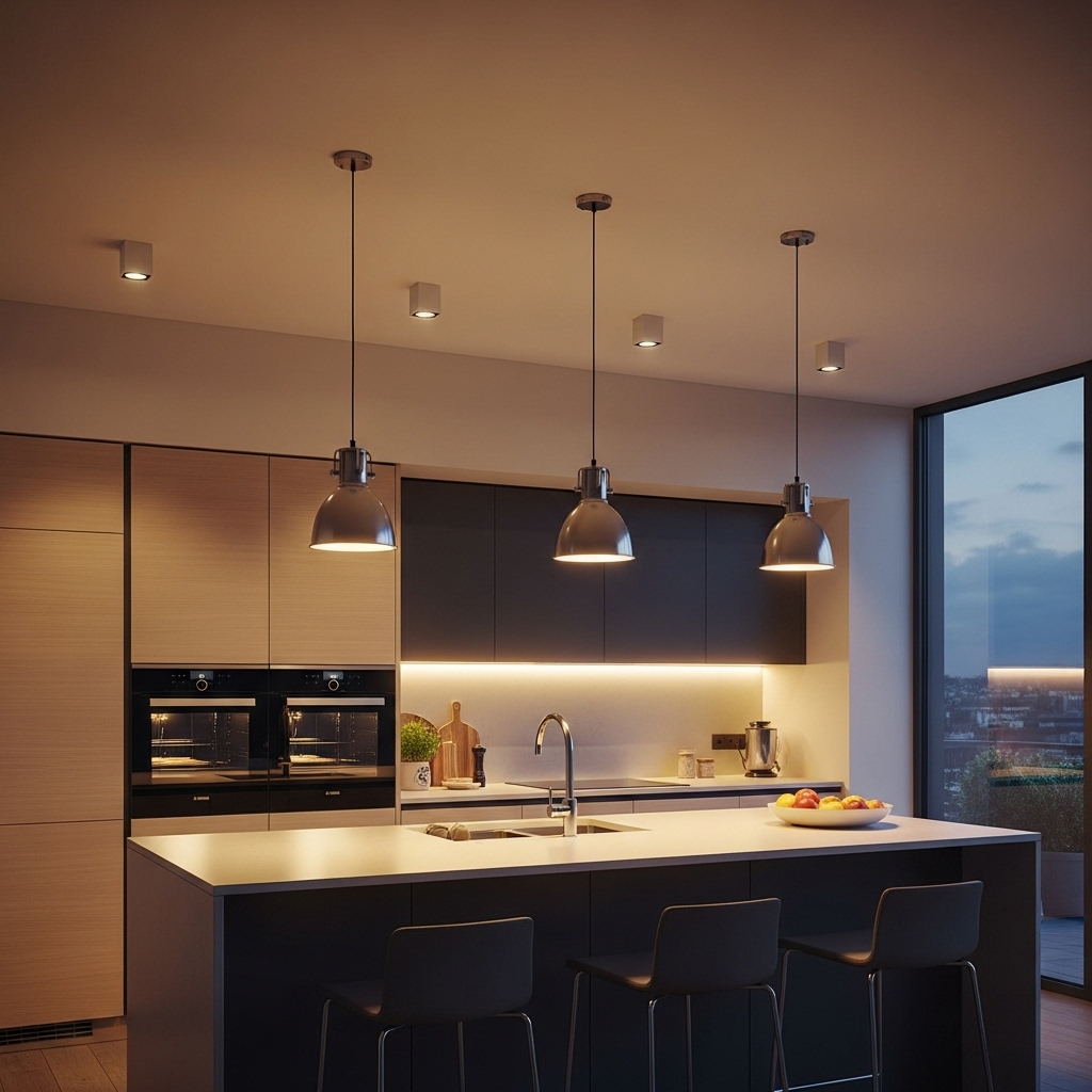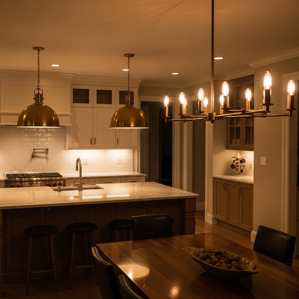Don’t stop at overhead lights. Combine pendant lights, recessed ceiling lighting, and under-cabinet LEDs to create a layered, welcoming atmosphere that adapts to any occasion.