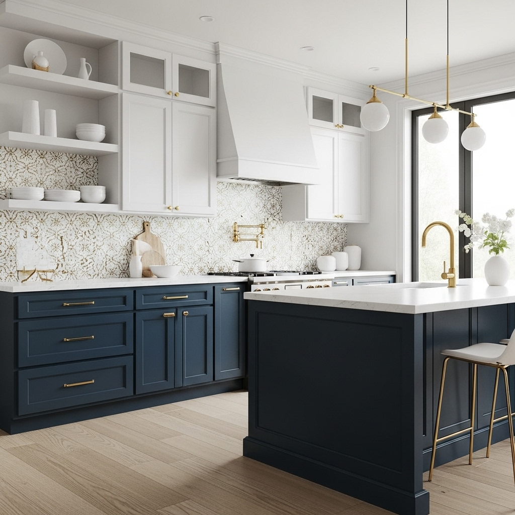 One of today’s hottest trends is mixing cabinet colors. For example, try navy lower cabinets paired with crisp white uppers. This contrast creates depth and personality without overwhelming the design.