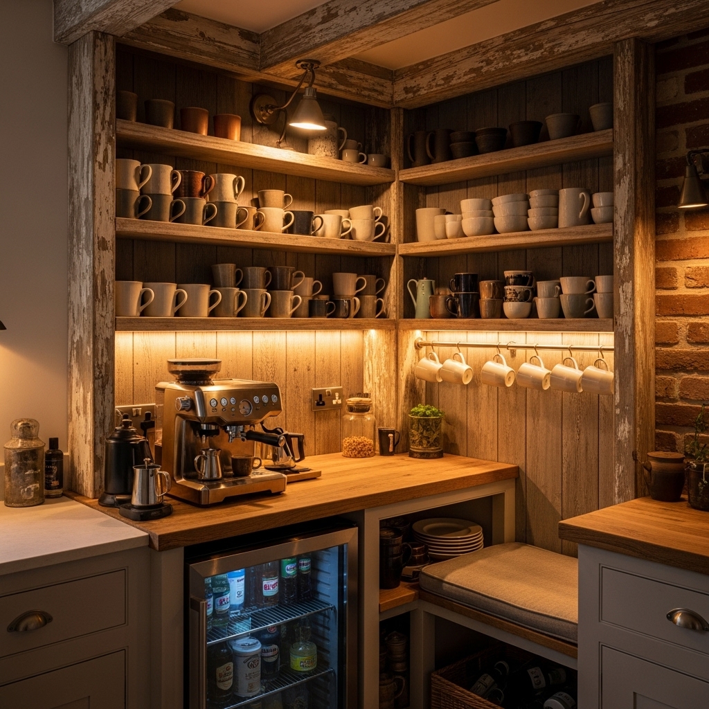 Turn a small corner of your kitchen into a cozy coffee bar. Add a stylish cart, built-in shelving, or even a mini-fridge for drinks. It’s both functional and charming.
