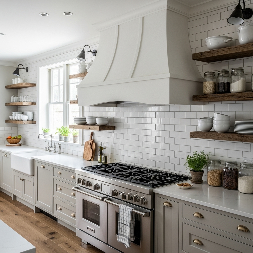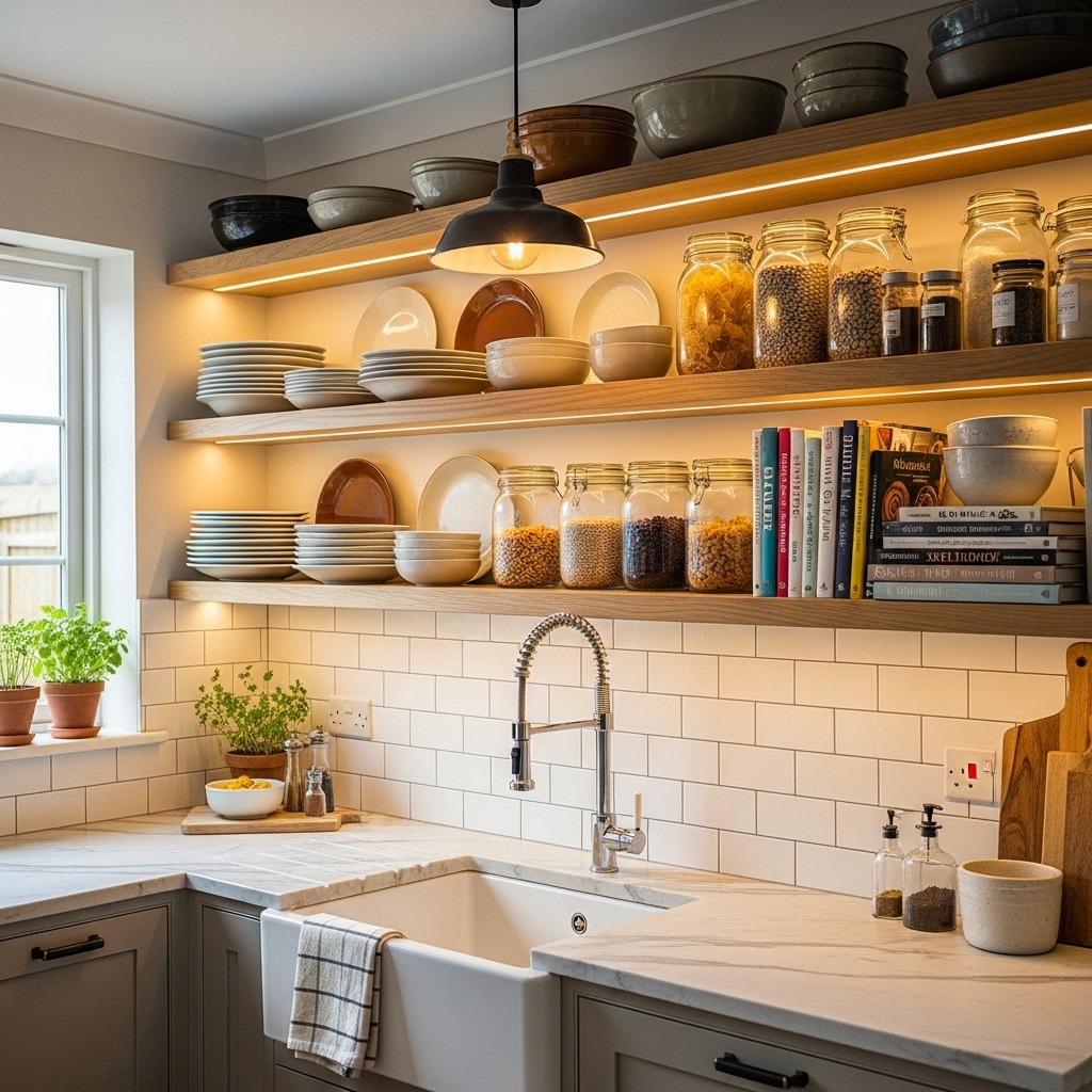 Trade bulky cabinets for open shelves. They create an airy feel and allow you to display your prettiest dishware, glass jars, or cookbooks. Keep it simple by using wood planks or go bold with metal brackets for an industrial vibe.