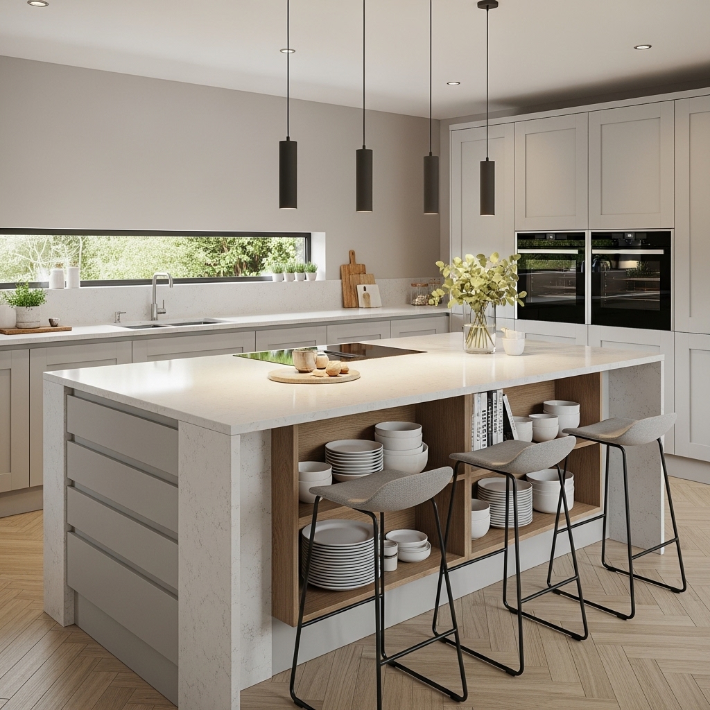 A well-designed island is more than a statement piece—it’s practical too. Incorporate extra cabinets, hidden drawers, or even open shelving underneath the island for both storage and style.