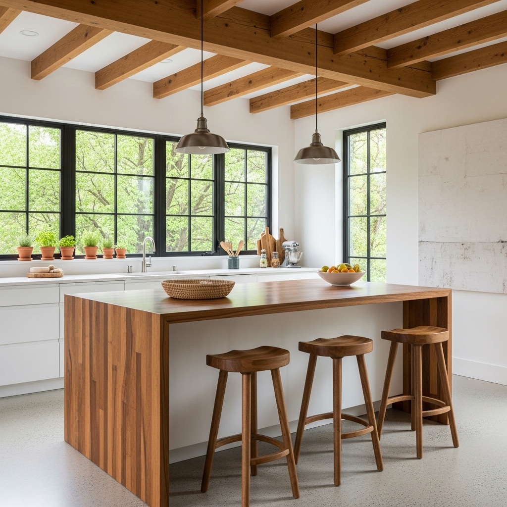 Whether through butcher block countertops, ceiling beams, or wooden bar stools, incorporating warm wood elements softens modern designs and creates balance.