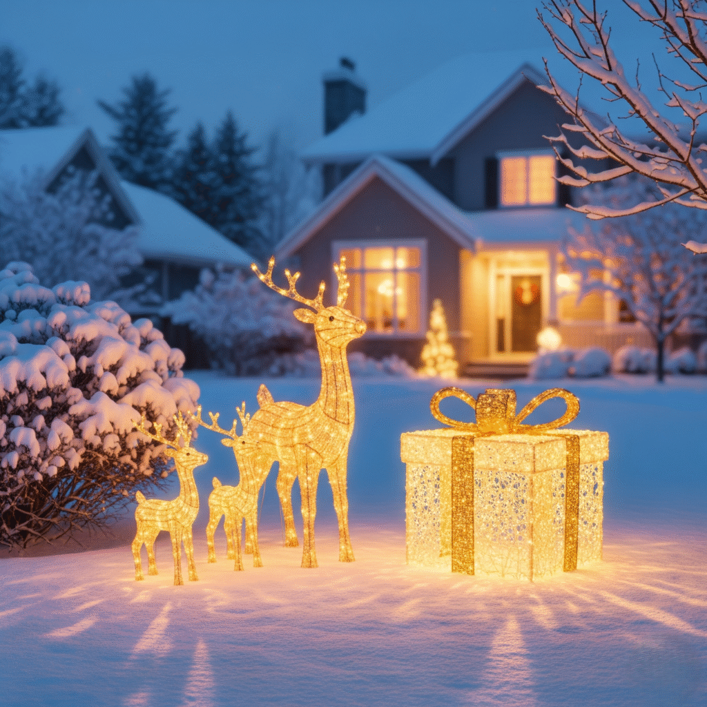 Add shaped lighted décor like reindeer, snowmen, or gift boxes to your yard.