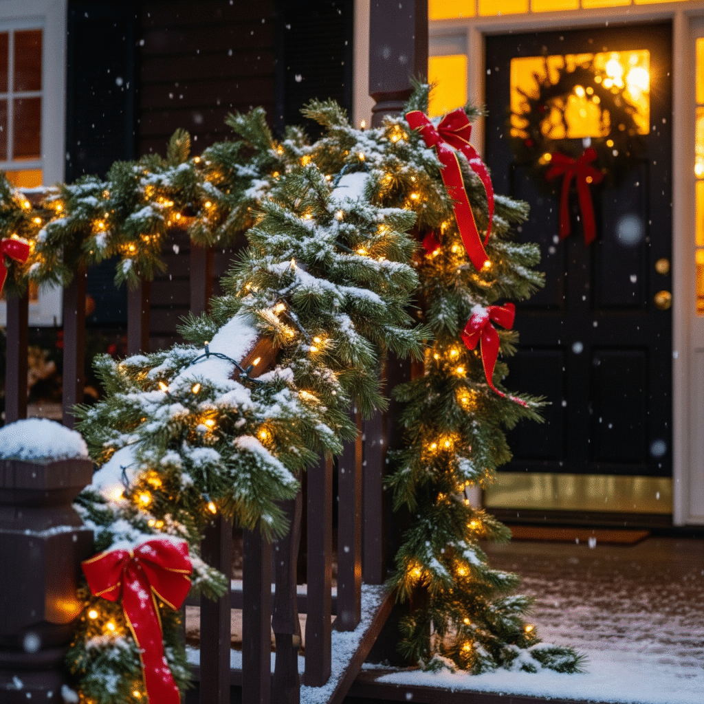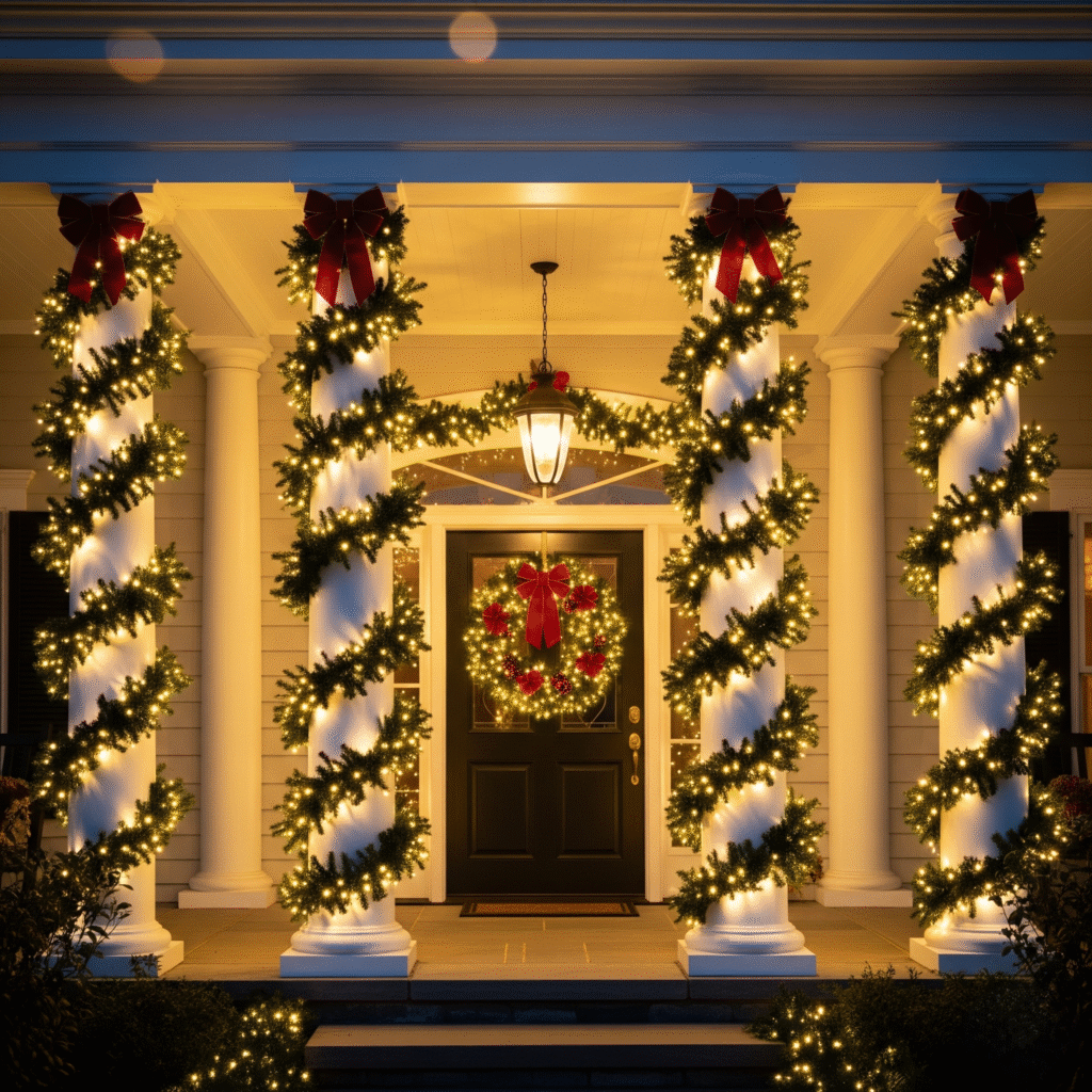 Wrap your porch railings or columns in lit garland for a lush, green touch.