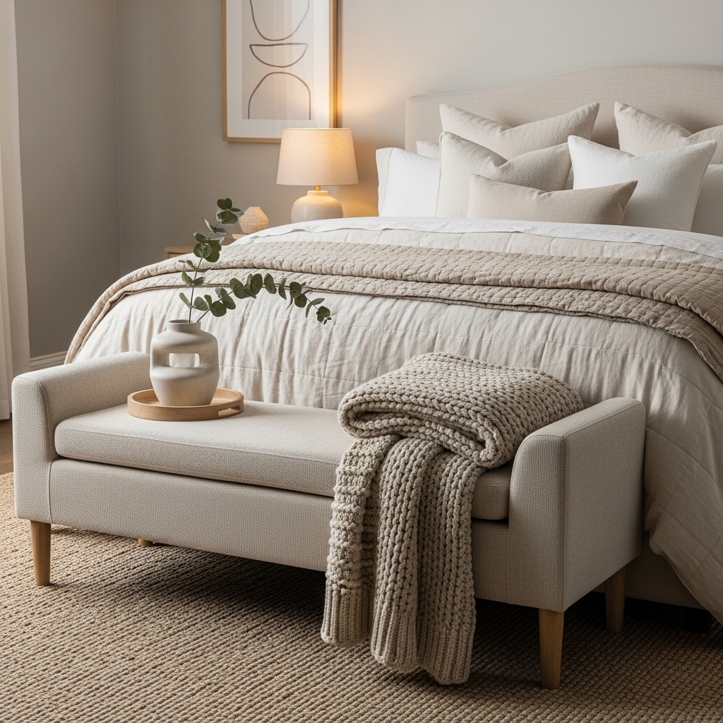 Place a fabric bench or ottoman at the foot of your bed to add both comfort and functionality. It’s perfect for seating, storing blankets, or displaying pillows.