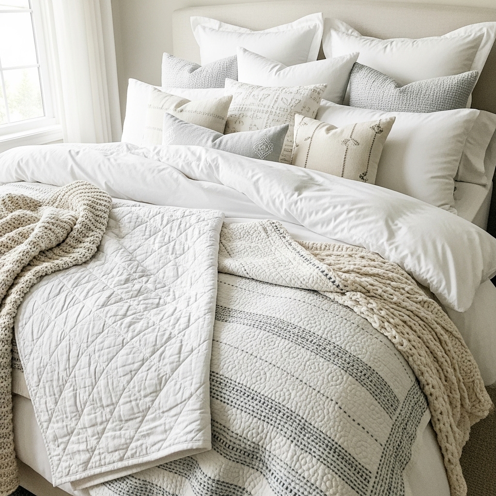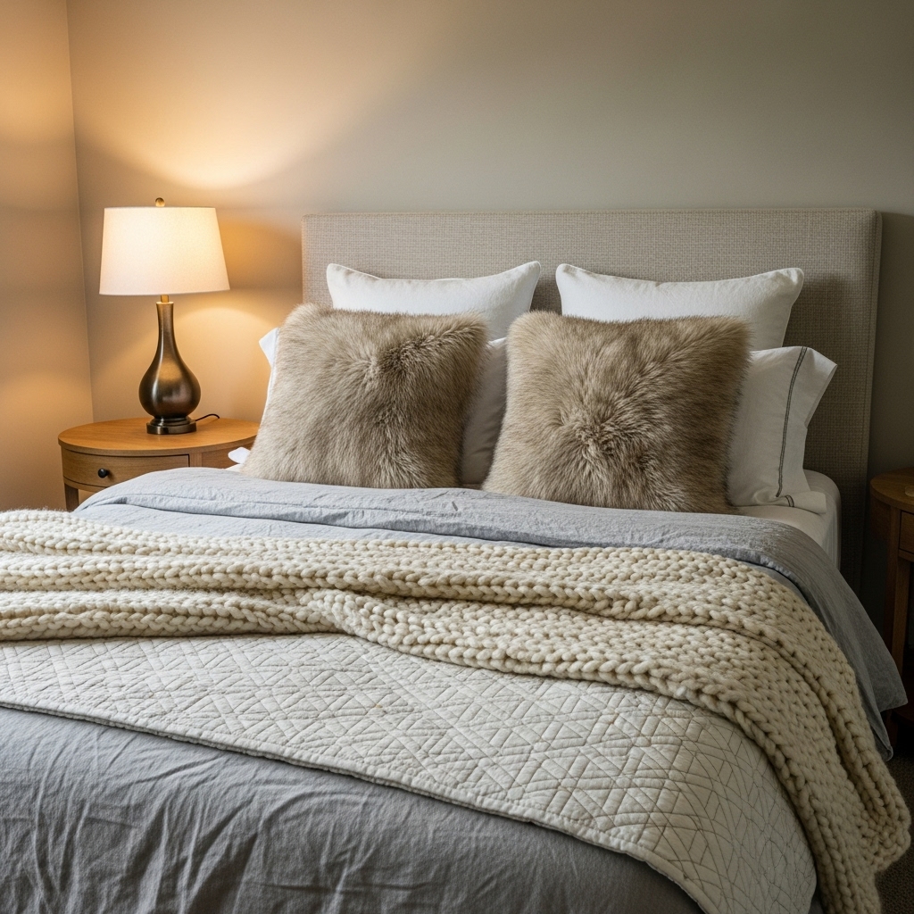 Soft textures can make a room feel instantly inviting. Mix throws, chunky knit blankets, faux fur pillows, linen bedding, and cotton quilts to create a layered look that feels rich and comfortable.