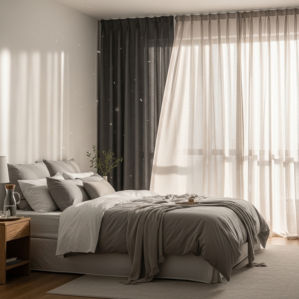 Sheer or linen curtains soften the room and let filtered light pour in during the day. For deeper coziness, layer blackout curtains behind them for a perfect night setting.