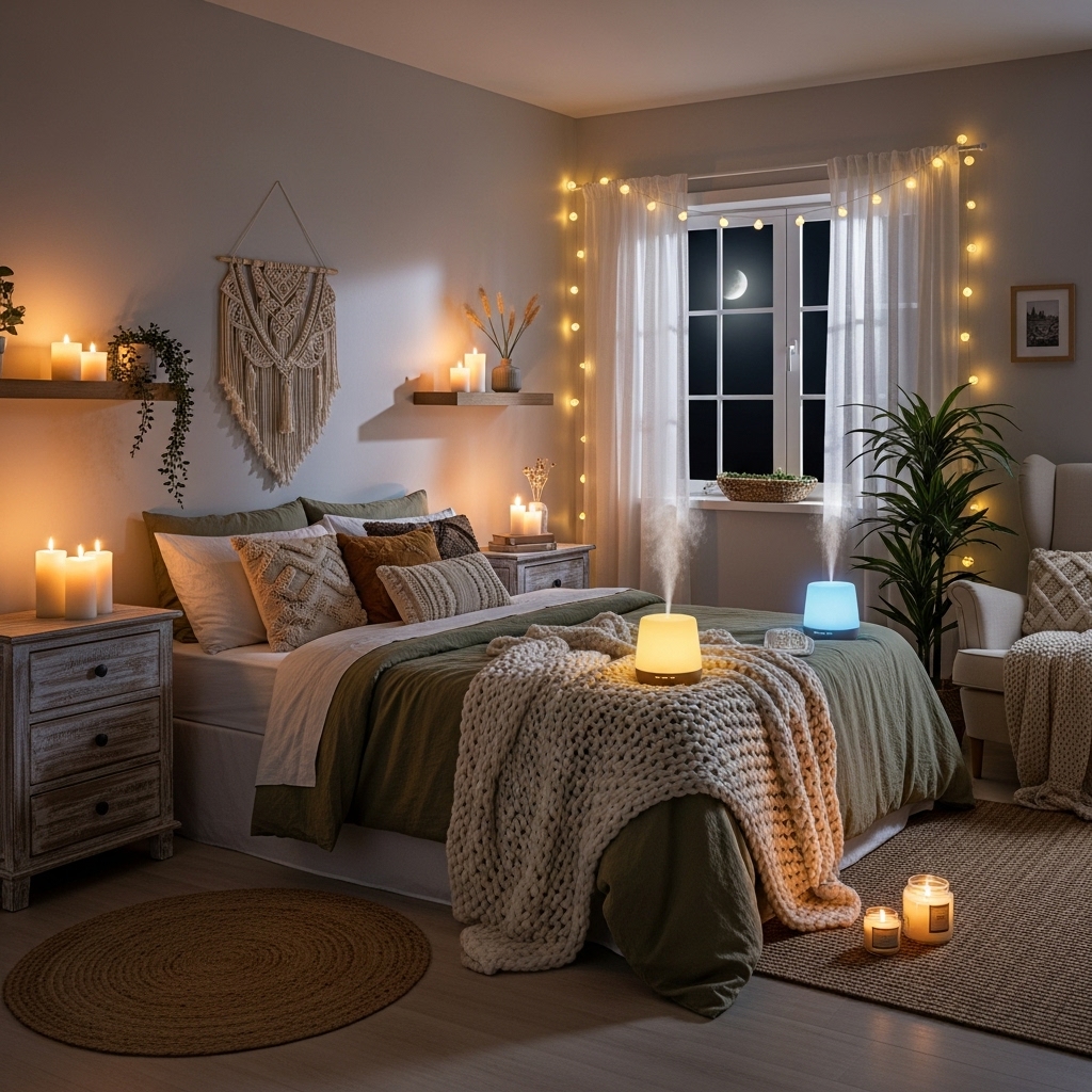 Essential oil diffusers, room sprays, or scented candles in warm notes like vanilla, amber, or sandalwood create a relaxing bedtime experience.