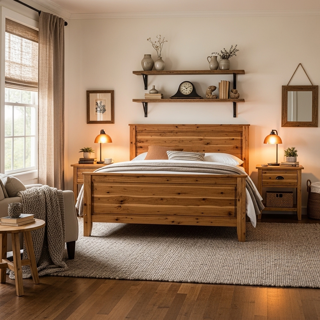 A bed frame with warm wood, fabric, or unique texture sets the tone for the entire bedroom. Look for designs that match your cozy aesthetic.