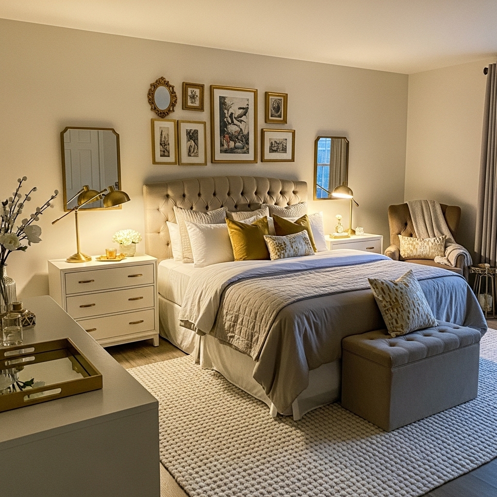 Bronze, brass, and gold décor pieces—like lamps, frames, or drawer pulls—add a subtle glow and richness that elevate the entire room.