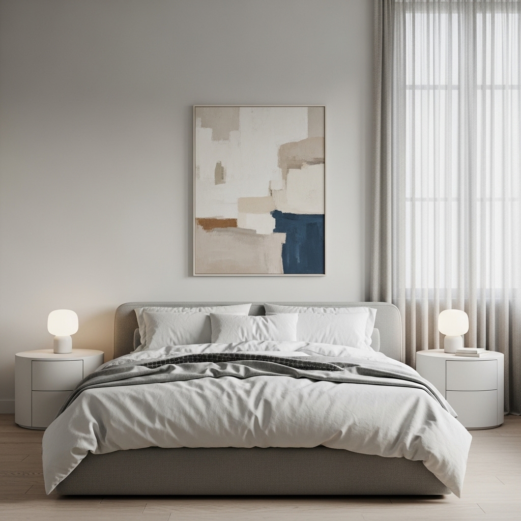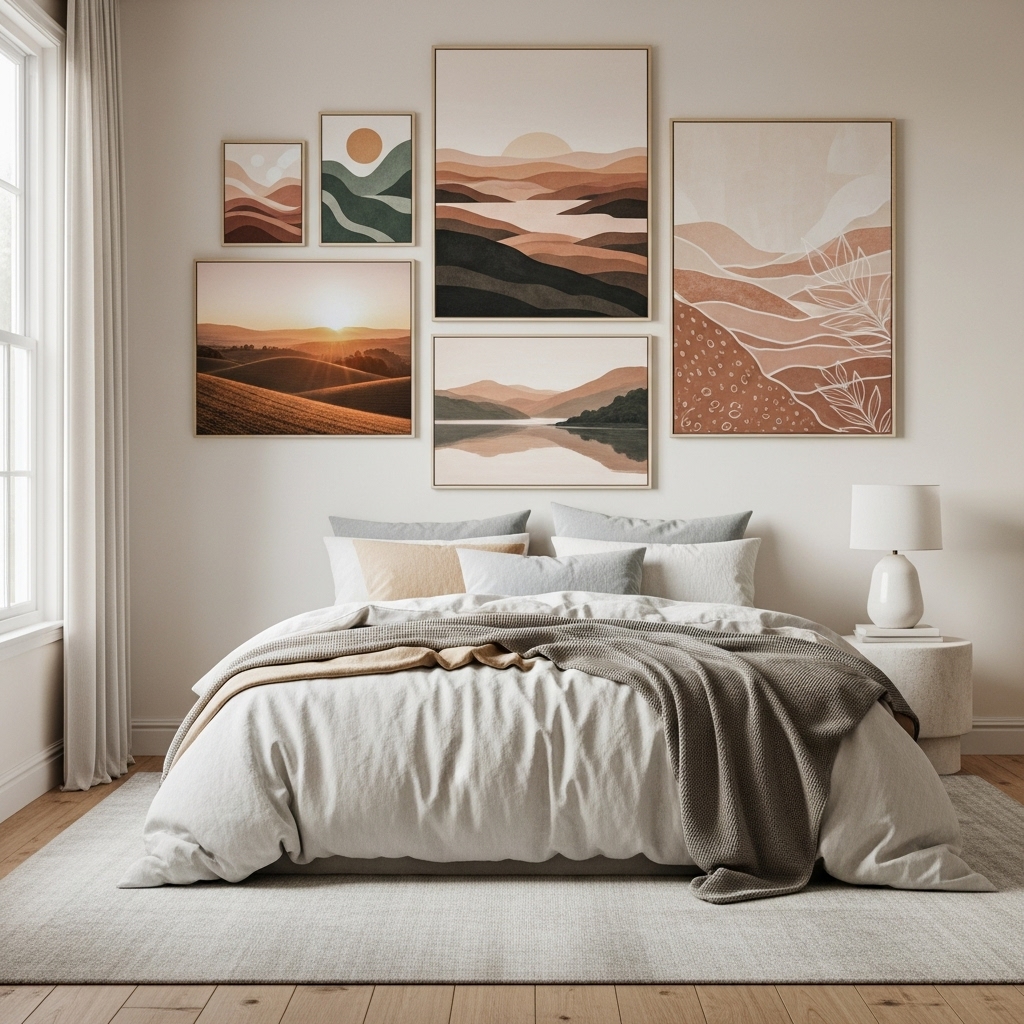 Art featuring landscapes, muted colors, or soft textures enhances the soothing atmosphere of your bedroom. Leaning frames instead of hanging them can add a casual, cozy feel.