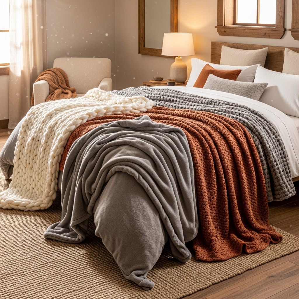 Whether draped over the bed or placed in a woven basket, throw blankets add warmth, texture, and charm. Mix different materials for a layered, lived-in feel.
