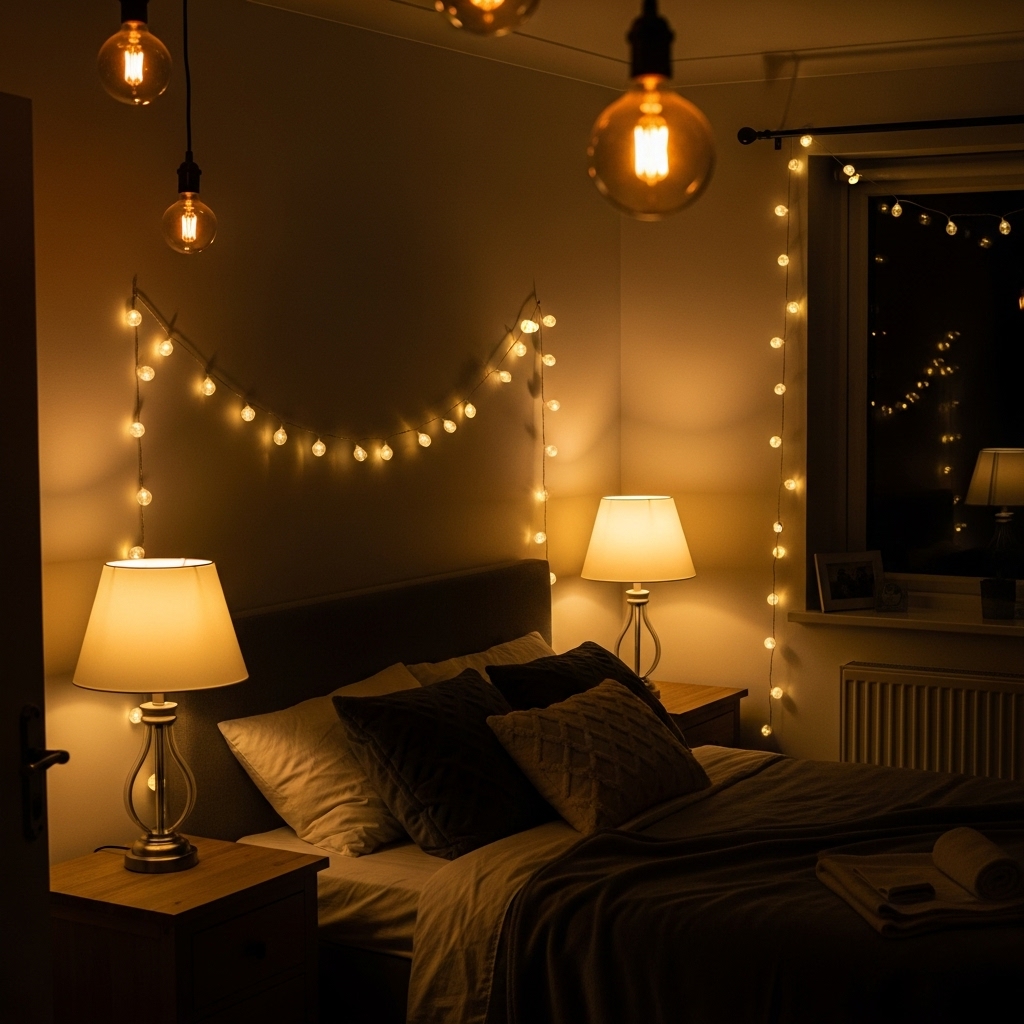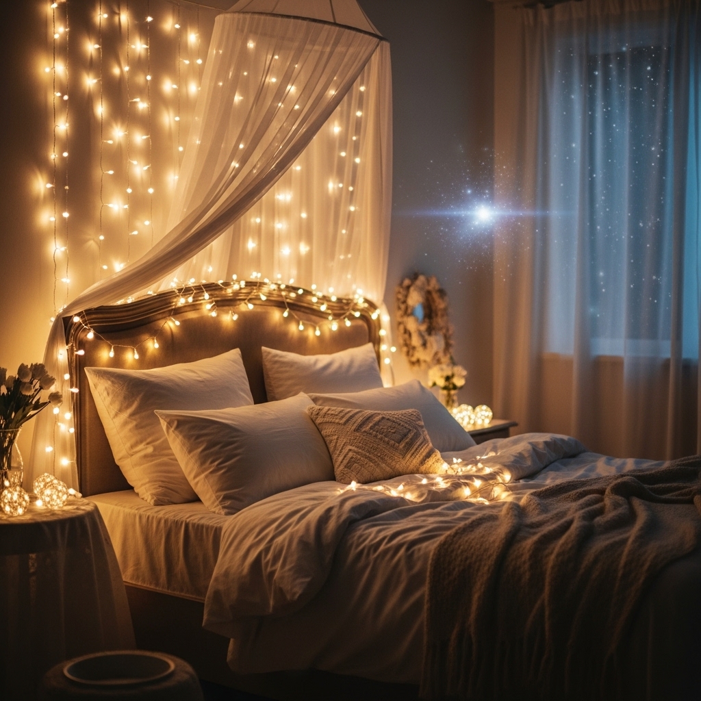 String lights add whimsy, charm, and warmth. Drape them over your headboard, window frame, or along the wall to create a dreamy evening glow.