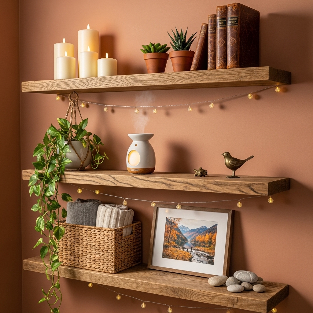 Floating shelves allow you to display candles, framed photos, books, or greenery. They help personalize the room while keeping the floor space open and peaceful.